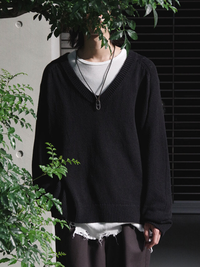 今また気分が高まっているVネックニット。トラッドなアプローチではなく、より自由でモードなスタイルに仕上げるため、スキッパーの要素を取り入れ、大きく首まわりを開いた独自のデザインに。
