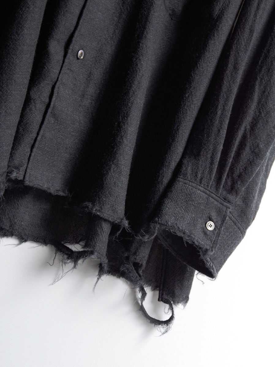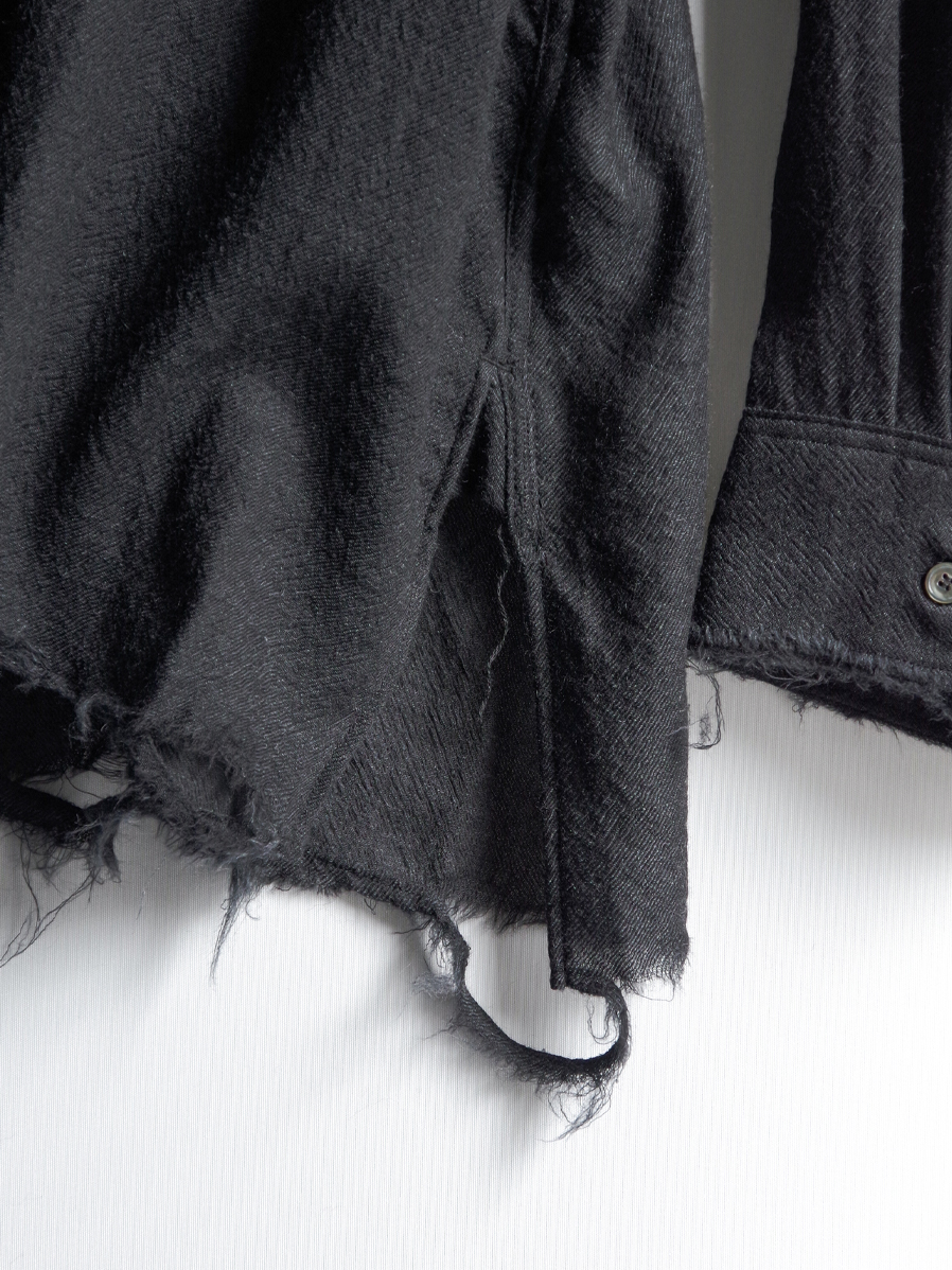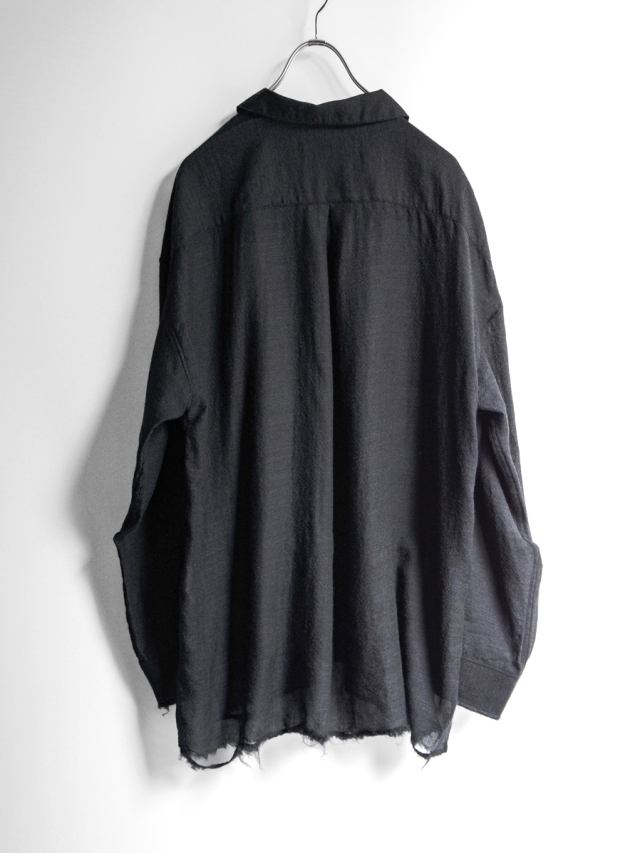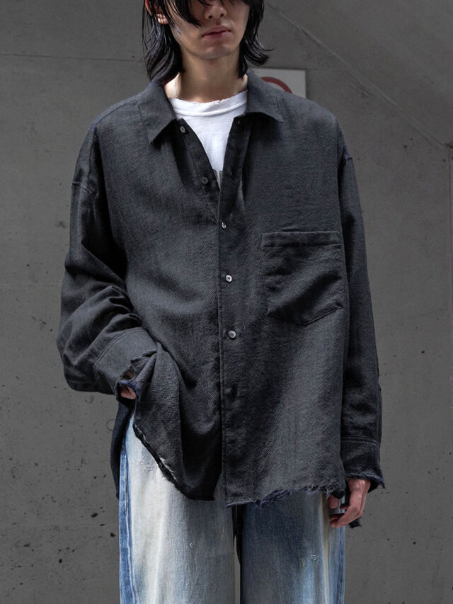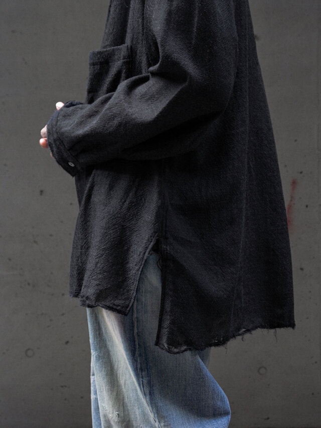 Though rooted in a classic silhouette, it incorporates raw-edge finishing at the collar, cuffs, and hem, adding subtle character while maintaining a clean overall look to highlight the beauty of the fabric.