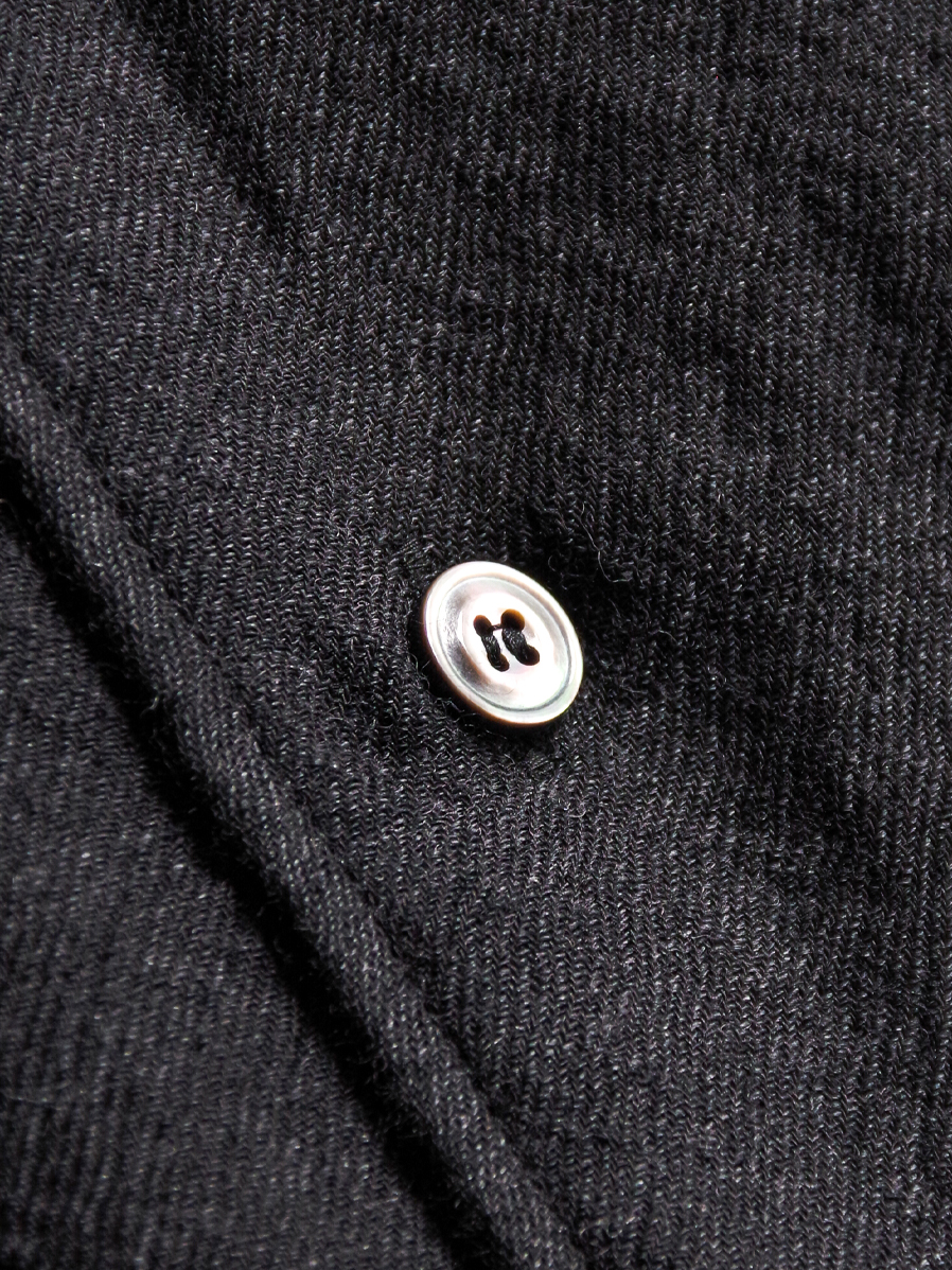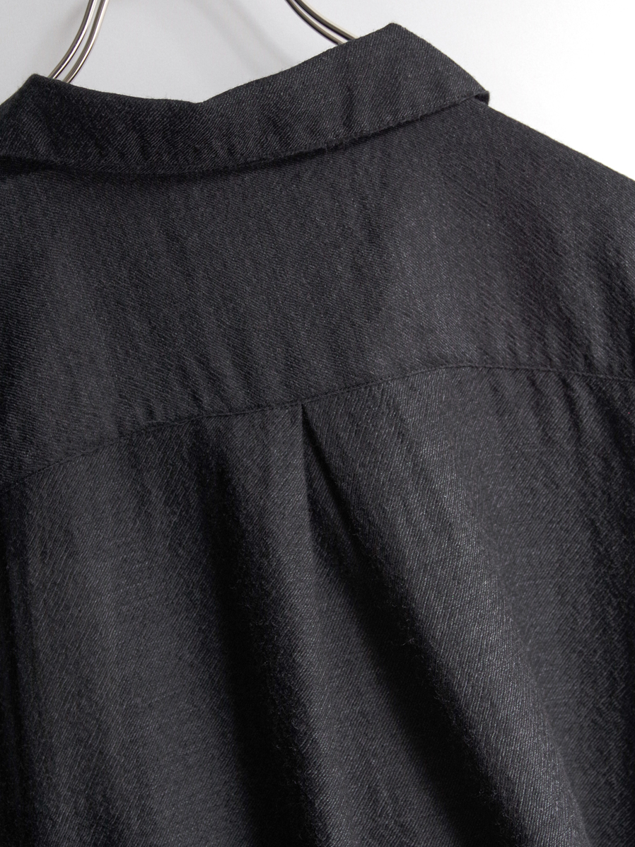 The shirt is made from wool chambray, woven loosely with fine yarns using different colors in the warp and weft to create a subtle two-tone effect that shifts with movement. A final finishing process adds further depth and richness to its surface.
