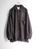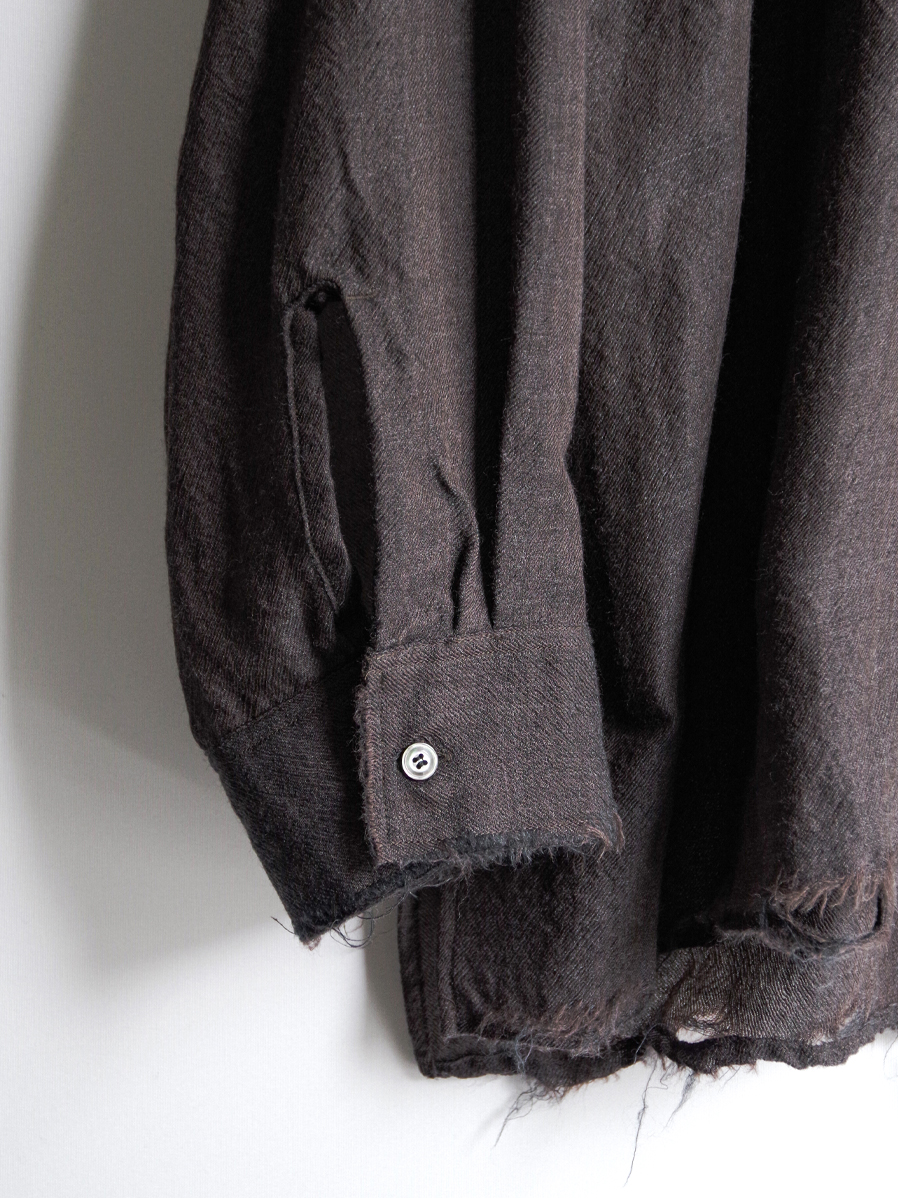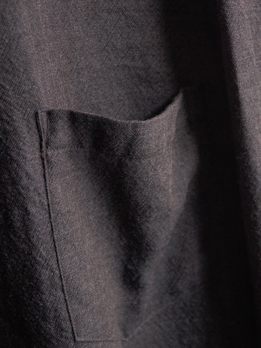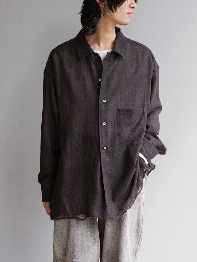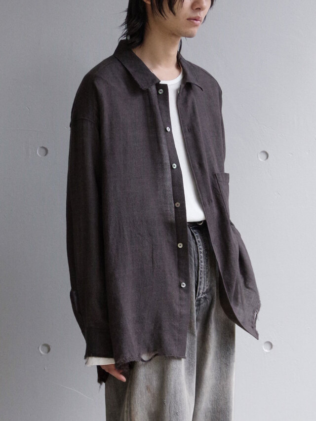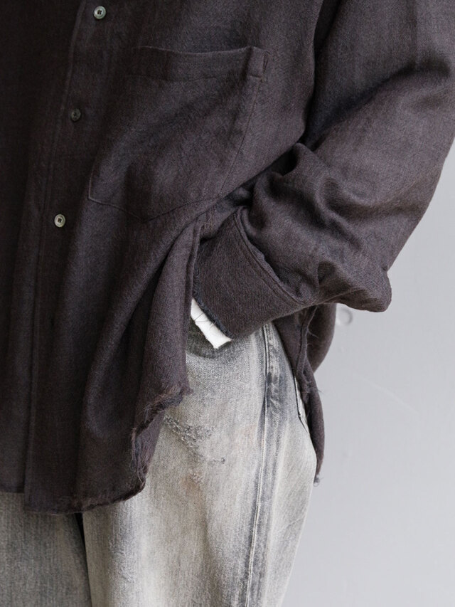 The shirt is made from wool chambray, woven loosely with fine yarns using different colors in the warp and weft to create a subtle two-tone effect that shifts with movement. A final finishing process adds further depth and richness to its surface.
