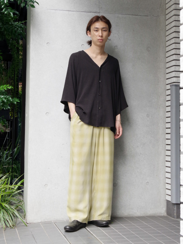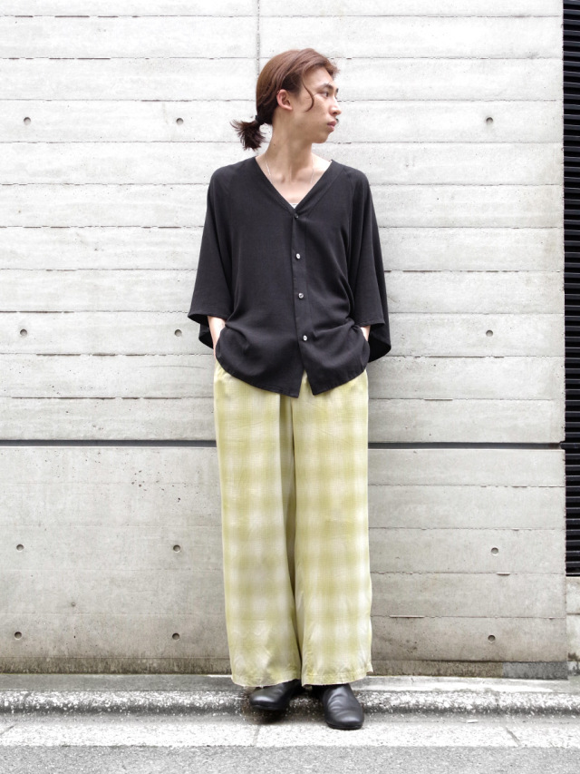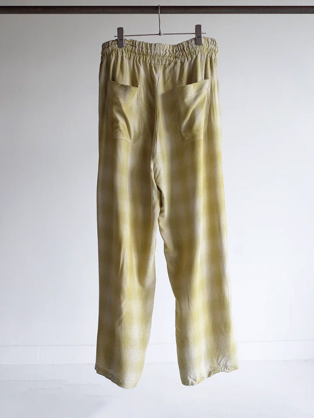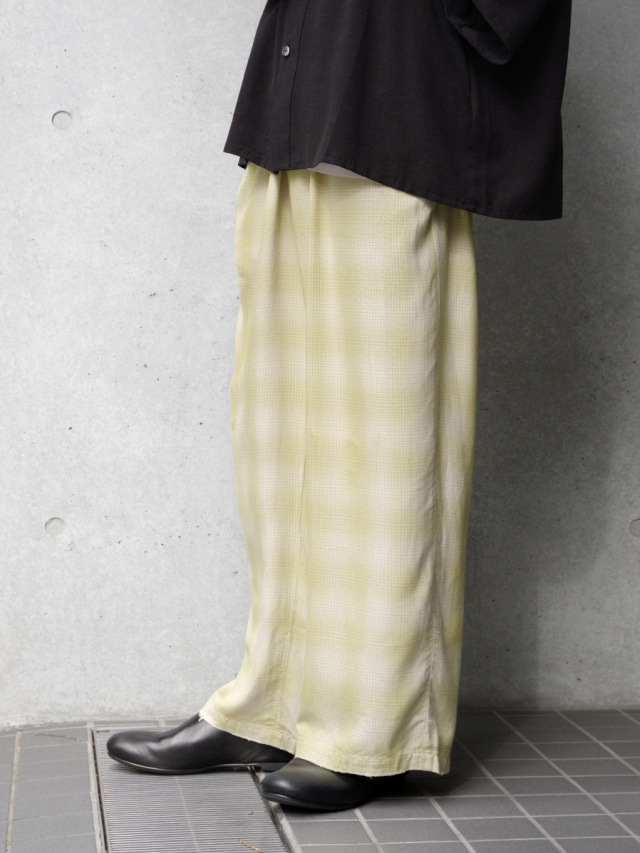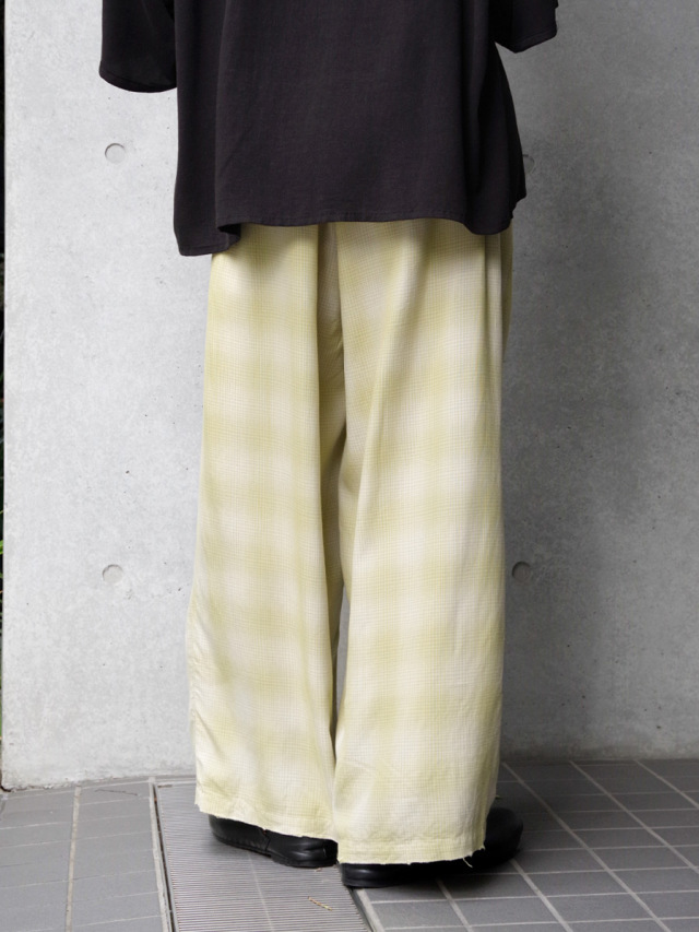 ブランドオリジナルで製作をしたRAYON100%のオンブレチェック生地を採用したイージーパンツ。ブランドの強みでもあるダメージ加工を1点1点手作業で行い、絶妙な塩梅に仕上がったアート性も感じられる仕上がりとなっています。