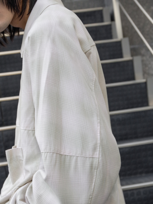 The silhouette is a square design with a wide width compared to a compact length. Taking advantage of the unique thickness and drape of rayon, it is designed to draw beautiful lines as both a shirt and a blouson.