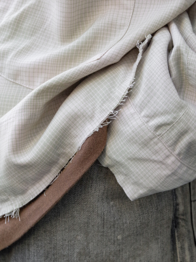 さらに、裾と袖口の断ち切りデザインが特徴的。使い込むほどに細い糸が垂れ、風に揺れるたびに繊細な動きを生み出します。