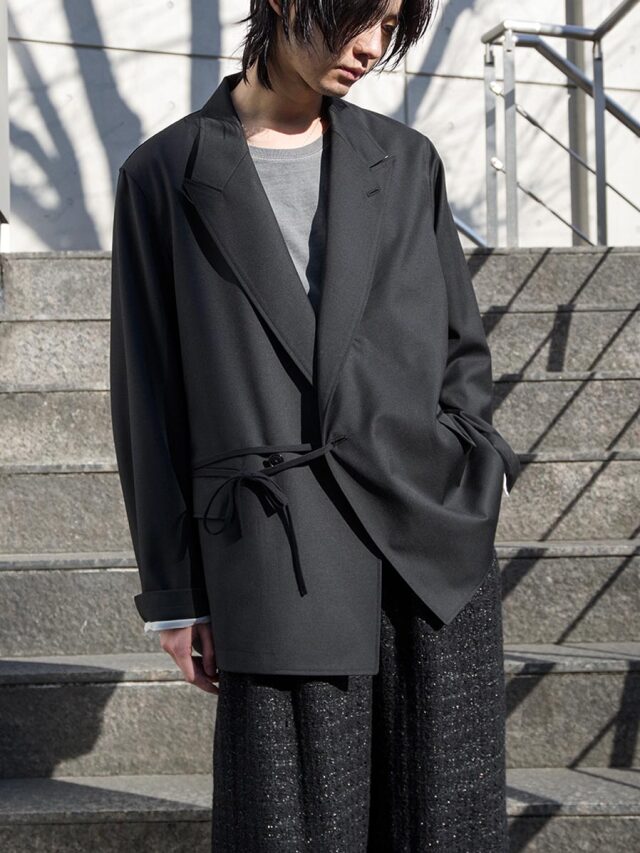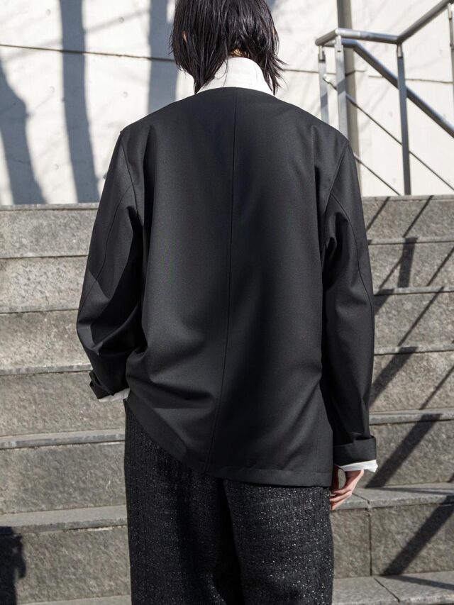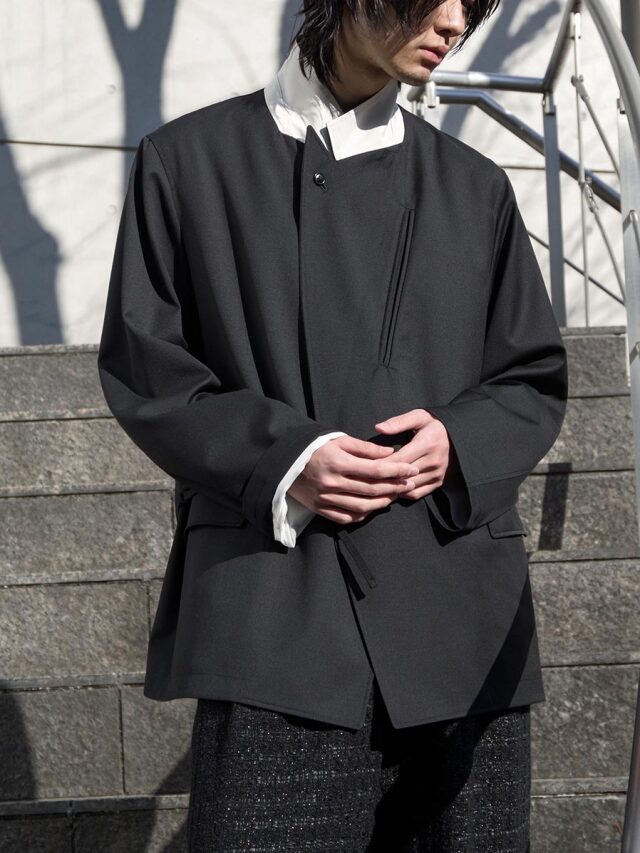 多様な着こなしを想定して設計された本作には、デザイナーのこだわりが随所に凝縮されています。着用するほどに、その奥行きとファッションの楽しさを実感できる一着です。