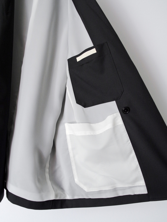 The jacket features a peak lapel that conveys both elegance and strength. A diagonally placed welt pocket on the left chest adds a subtle yet unique detail.