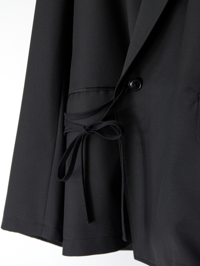 Tapes are set at the waist sides, allowing them to be threaded through buttonholes and tied in a manner reminiscent of traditional Japanese garments, introducing a refined fusion of Japanese and modern aesthetics.