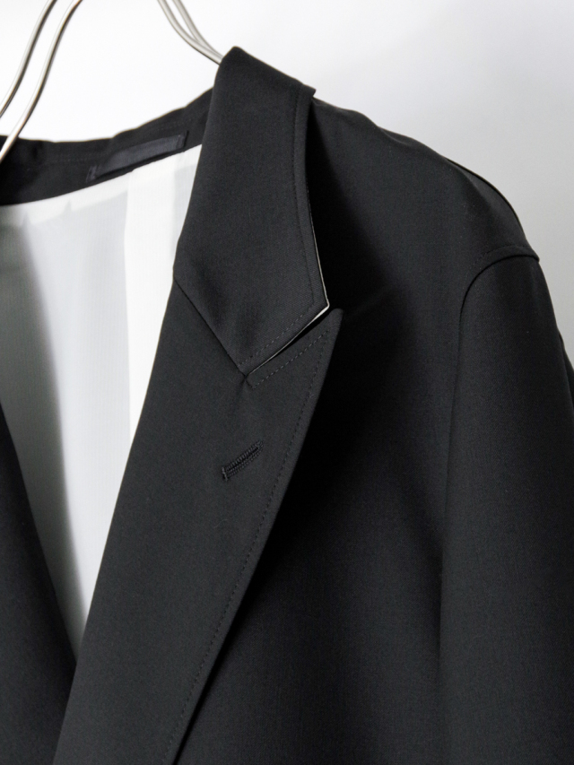 ラペルには、エレガントさと力強さを併せ持つピークドラペルを採用。左胸には斜めに配された玉縁ポケットを設け、さりげない個性を加えています。