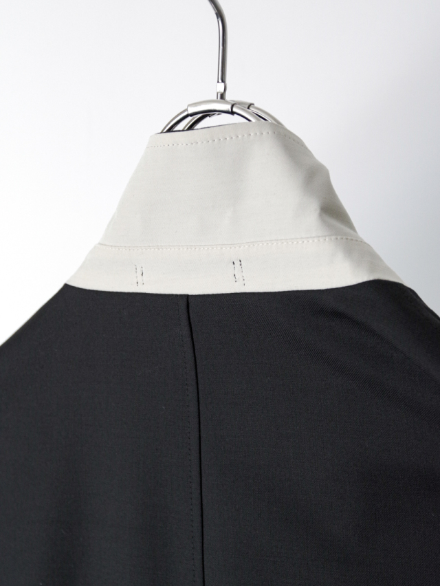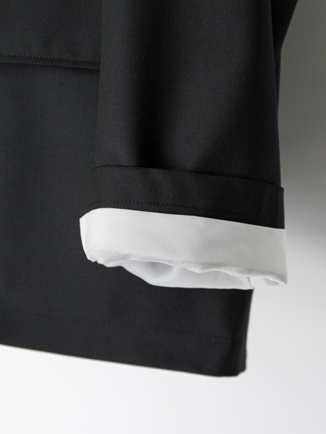 襟裏はスタンドカラーとしても機能し、ホワイトカラーで切り替えたアクセントに。袖口裏にも配色生地をあしらい、ロールアップ時の見え方にも配慮されています。