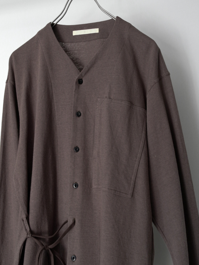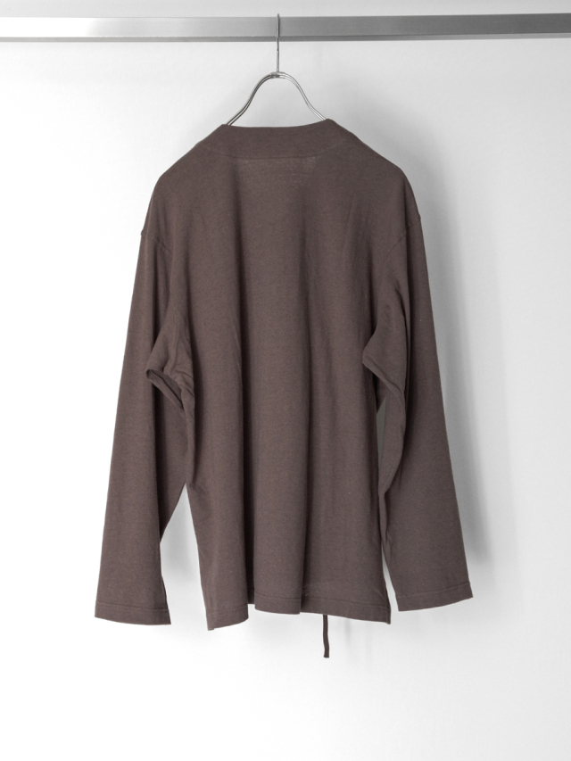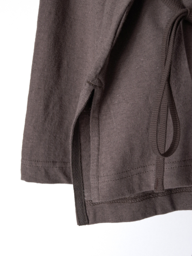 The silhouette features a relaxed fit with moderate volume. The V-neck design carries an oriental nuance, allowing it to be worn lightly as a layer or styled with a Japanese-inspired look by fastening the side tapes. It also works well as an inner layer under jackets, creating depth through layering around the neckline.