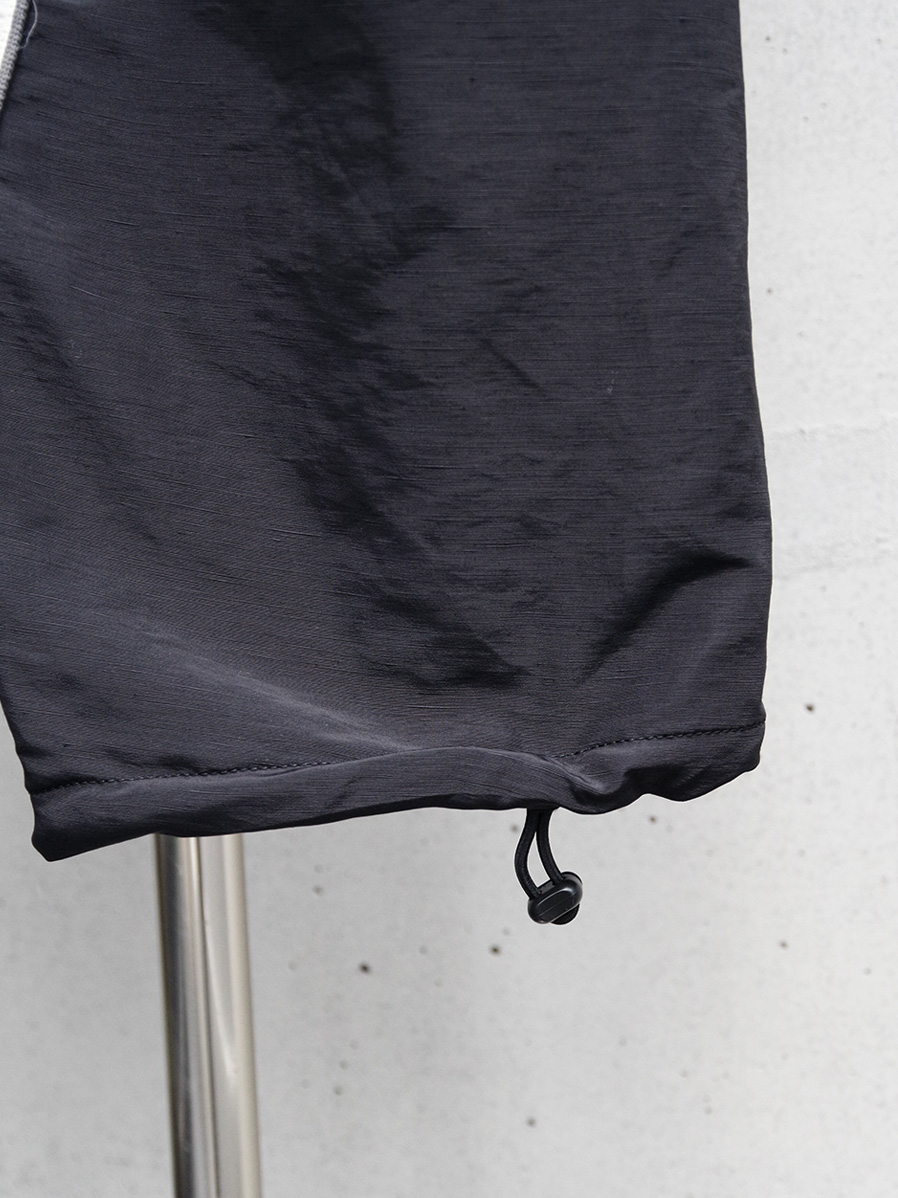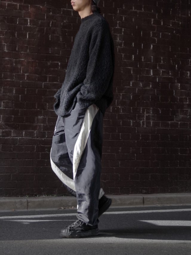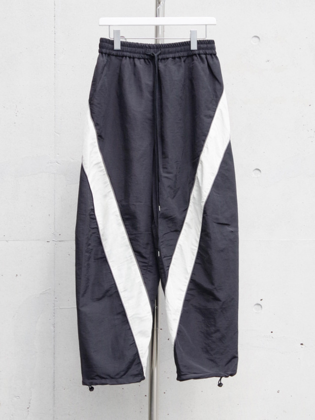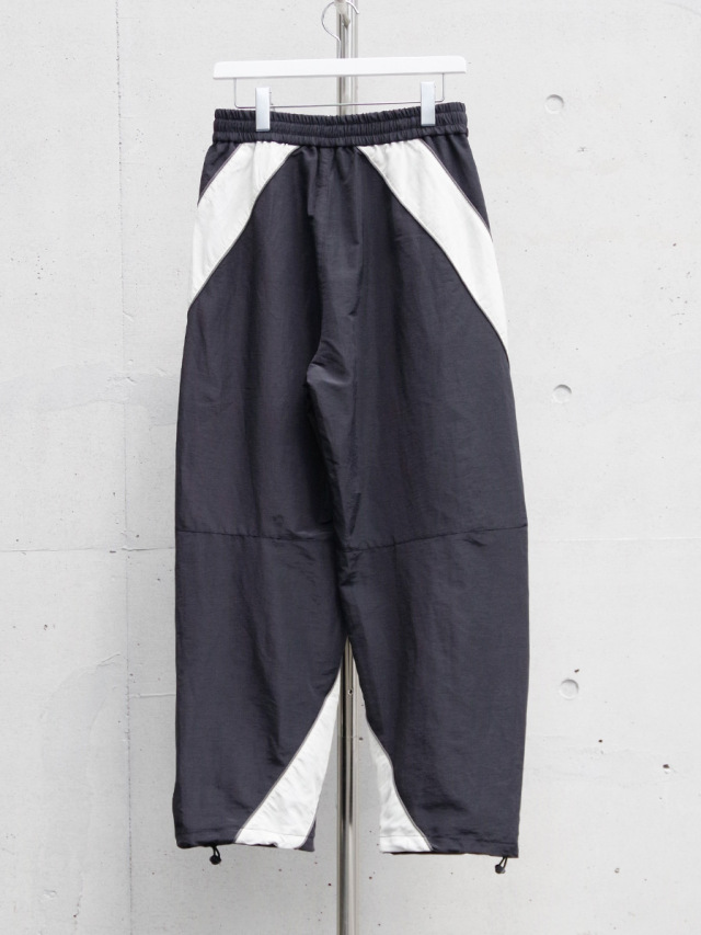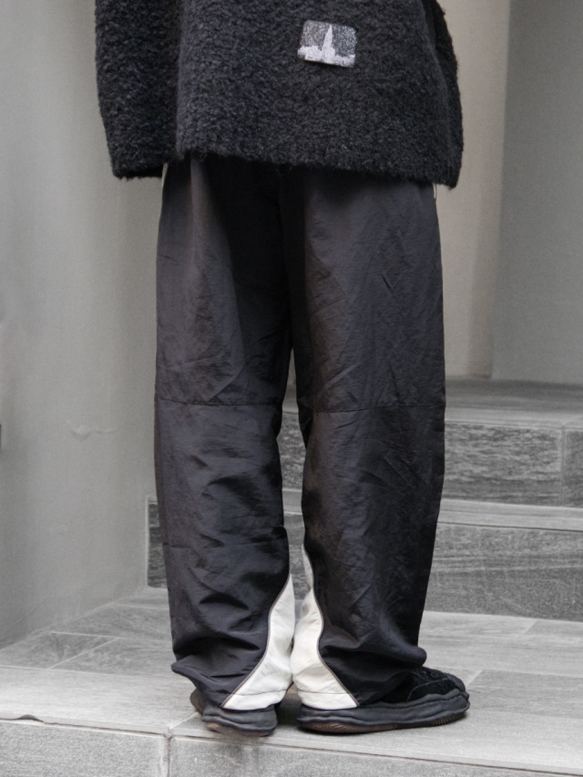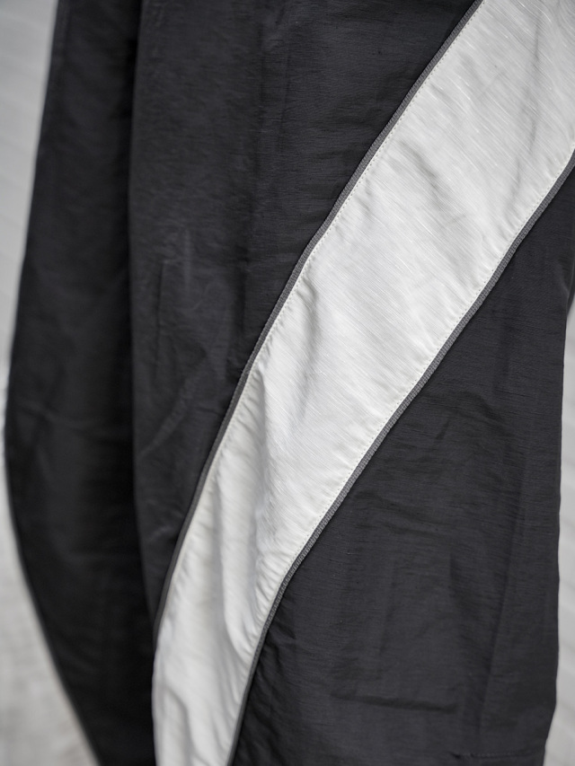 アメリカ空軍兵士のトレーニングパンツIPTUパンツをデザインベースに、より都会的で洗練されたシルエットとデザインへアップデート。ぐるりと巻き付くように施されたホワイトカラーの配色の切り替えは、パネル状に組み合わせながら立体的に縫い合わせることで表現。非常に高い職人の縫製技術を感じさせます。