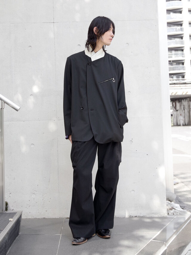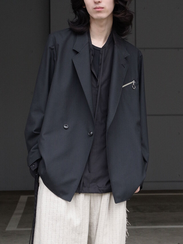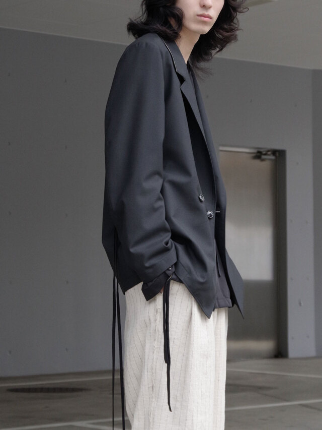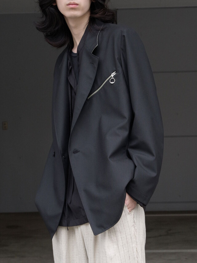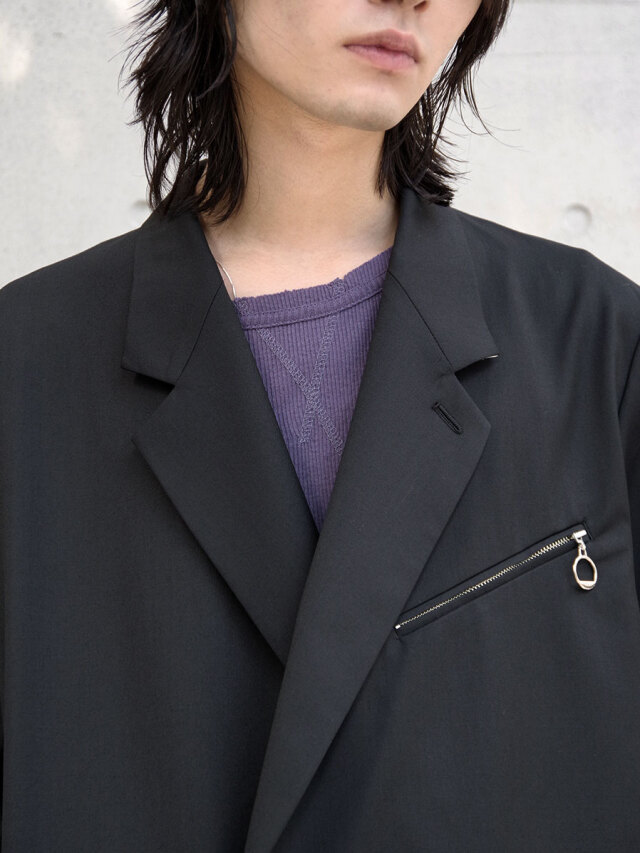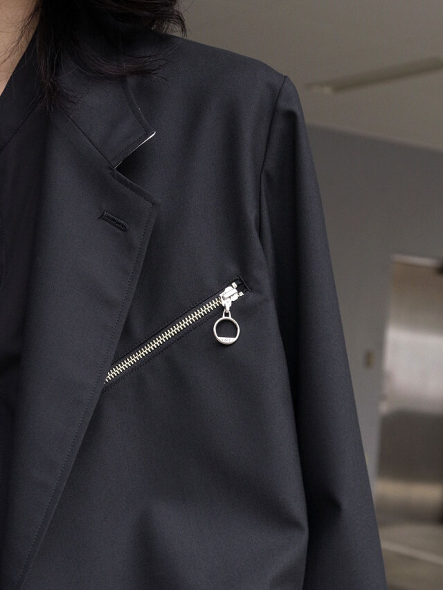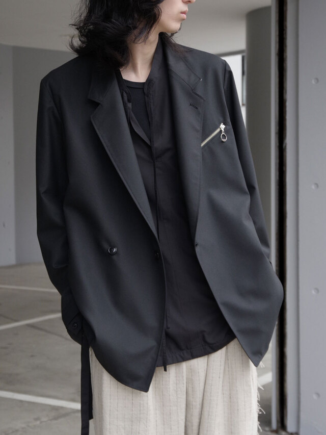 今季はノッチドラペルタイプのデザインが採用され、カジュアルにもモードにも、より幅広いシーンで活躍する仕上がりに。左胸にはファスナーポケットが設けられ、ダブルブレスト構造で内側に設けられた吊りベルトがデザインアクセントになる仕掛けも。右脇下に設けられたスピンドルにてカシュクールのようにも着用でき身幅の調節、アレンジを可能としています。より和でモードな印象をプラスしています。