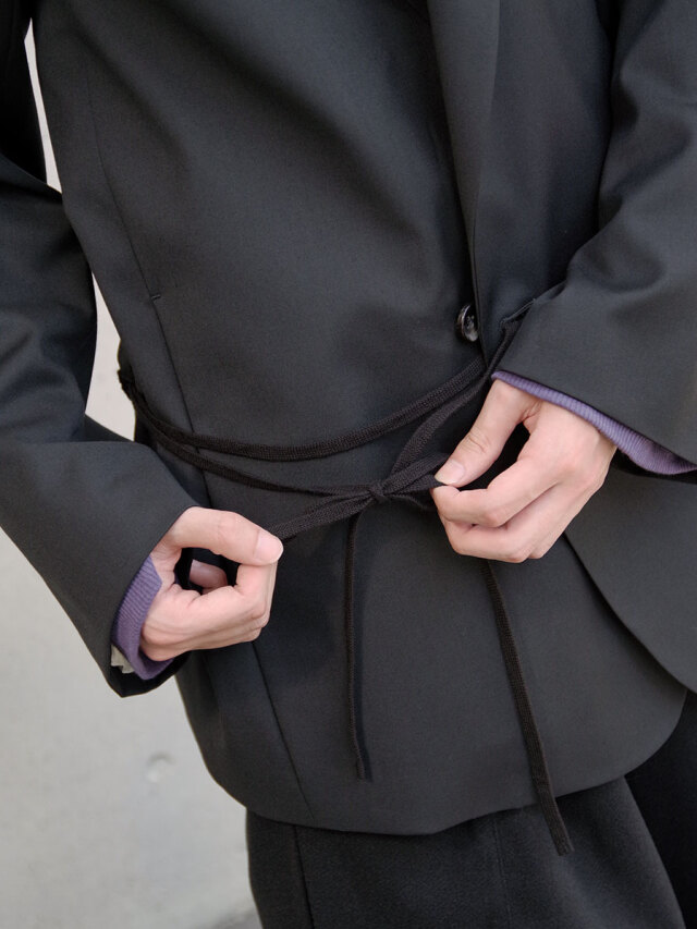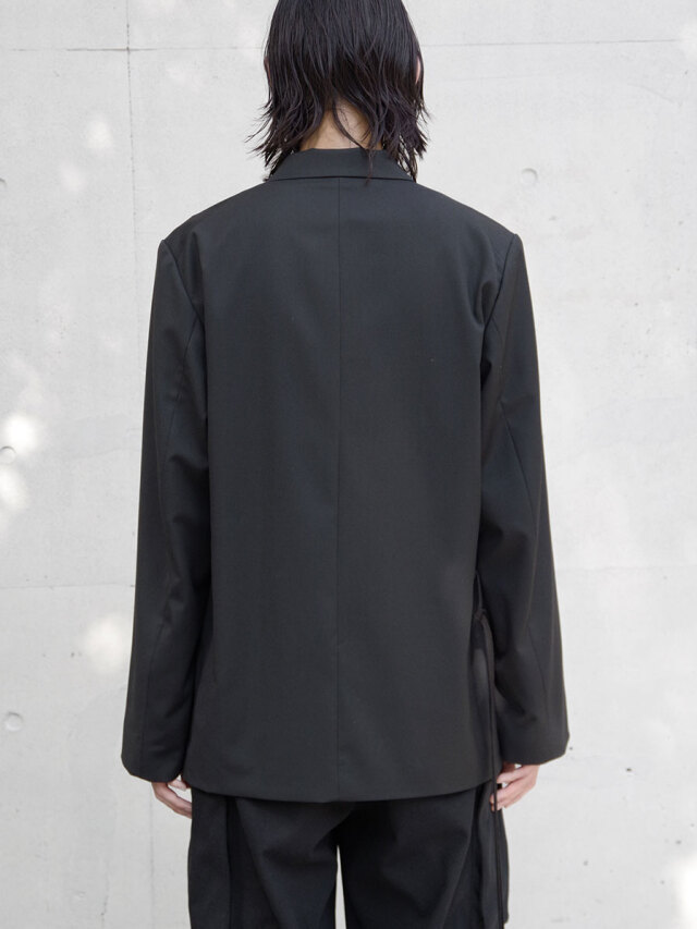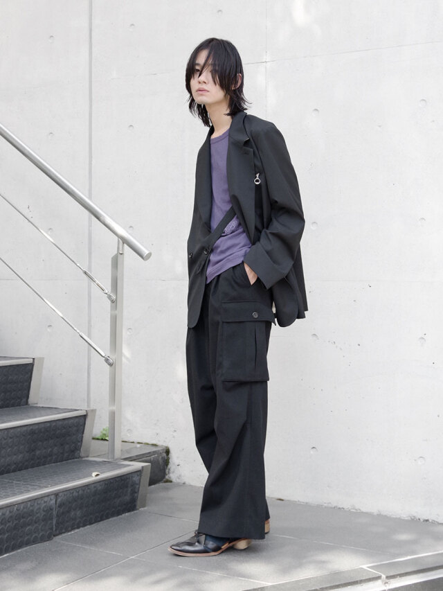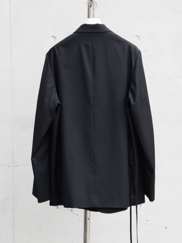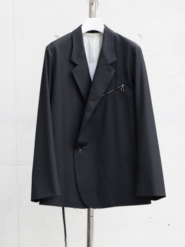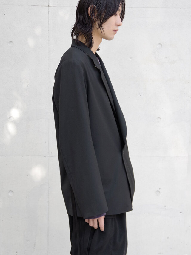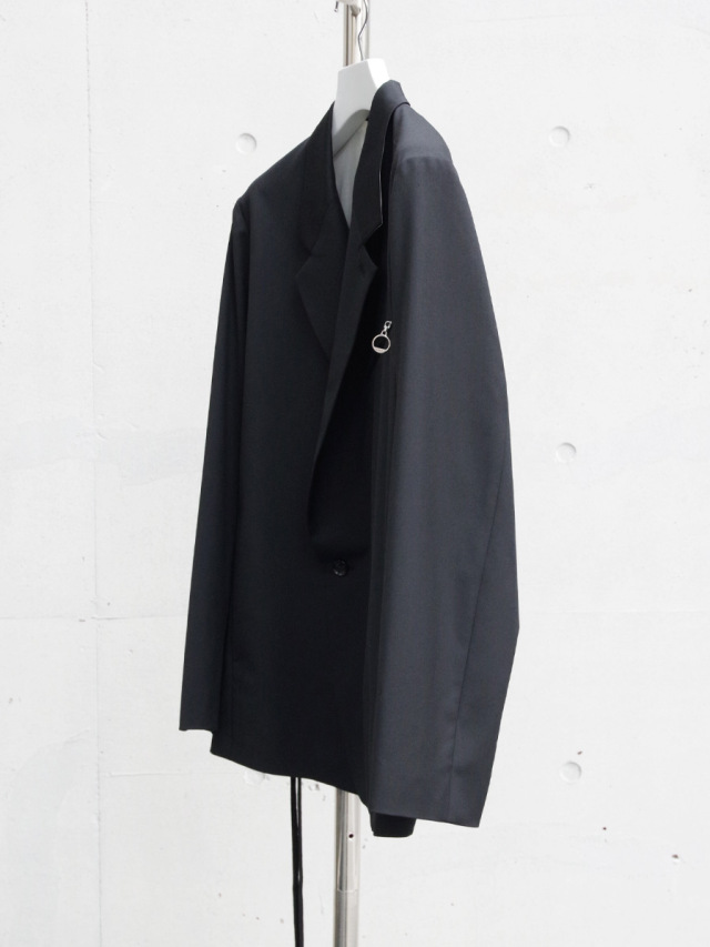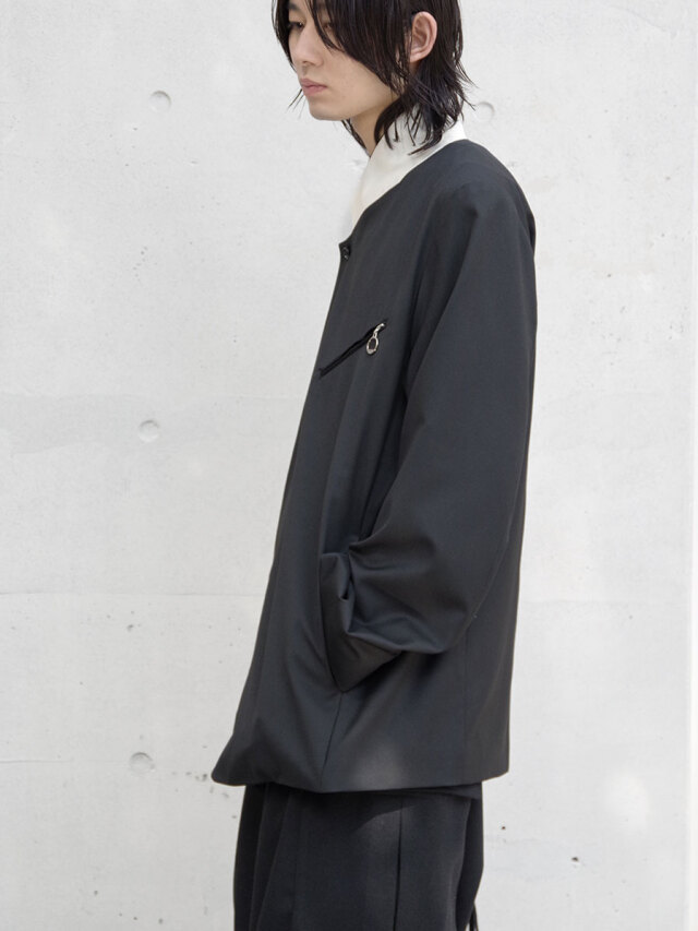 今季はノッチドラペルタイプのデザインが採用され、カジュアルにもモードにも、より幅広いシーンで活躍する仕上がりに。左胸にはファスナーポケットが設けられ、ダブルブレスト構造で内側に設けられた吊りベルトがデザインアクセントになる仕掛けも。右脇下に設けられたスピンドルにてカシュクールのようにも着用でき身幅の調節、アレンジを可能としています。より和でモードな印象をプラスしています。