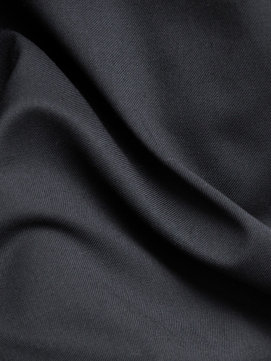 素材にはポリエステルをベースにテクニカルトロピカル素材を採用したイージーケア性も持ち合わせたテキスタイル。厳選された原料の上質な質感、特殊な仕上げ加工による、滑らかな肌触りとドレープ感。濃度が深いブラックカラーも特徴的です。
