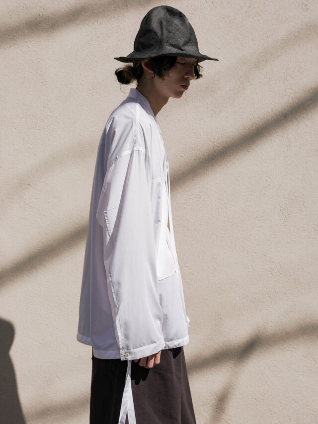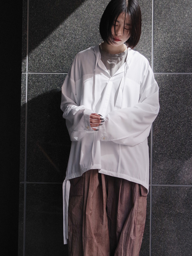 垂れ下がるリボンがアクセントになり、広い身幅と袖口を広くとったオリエンタルな雰囲気が魅力的な一着です。