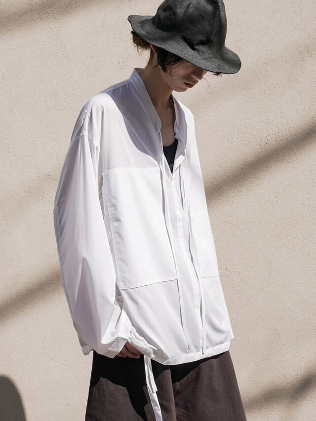 素材にはレーヨンポリエステルのポプリン素材を採用。滑らかな肌触りに加え、控えめな光沢とクタッとした落ち感が印象的で、ポリエステルがブレンドされることでシワになりづらくイージーケアな性能も。
