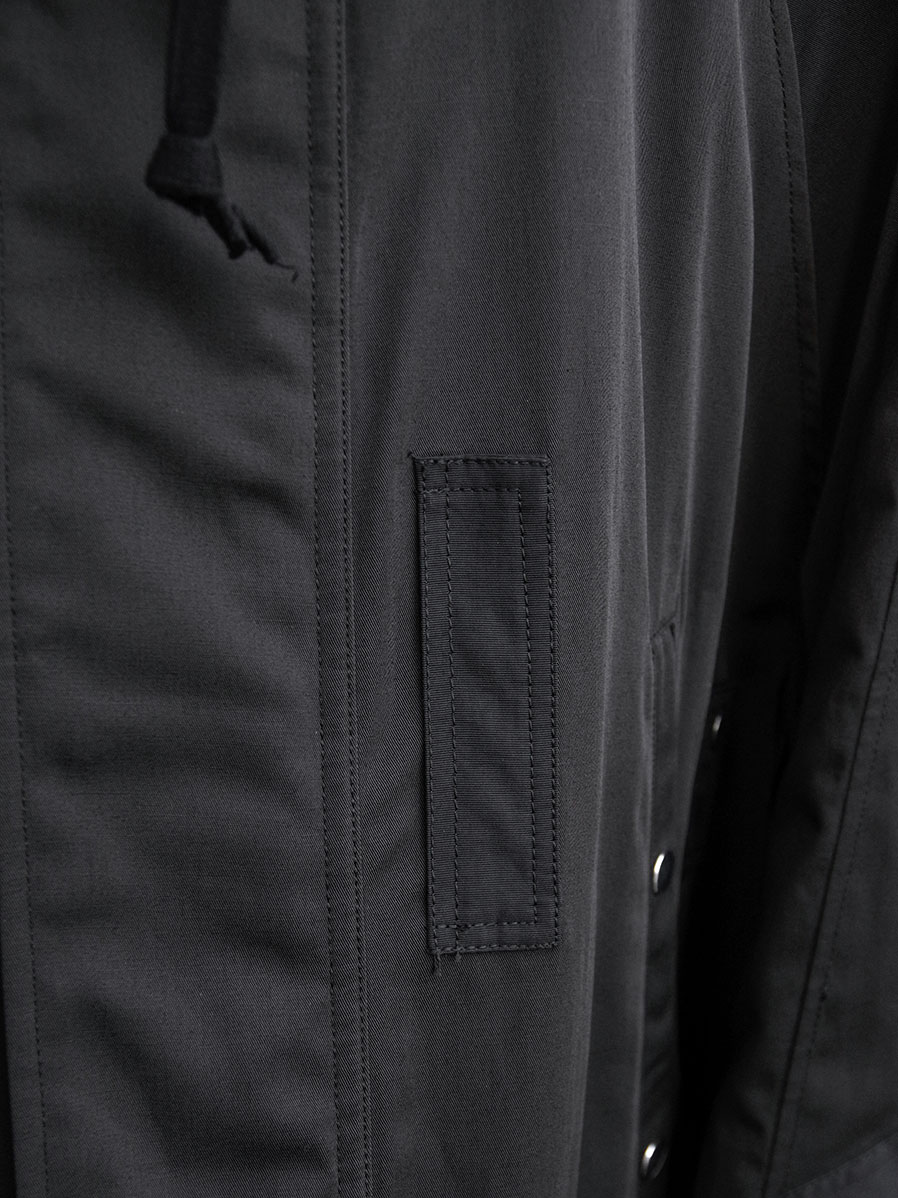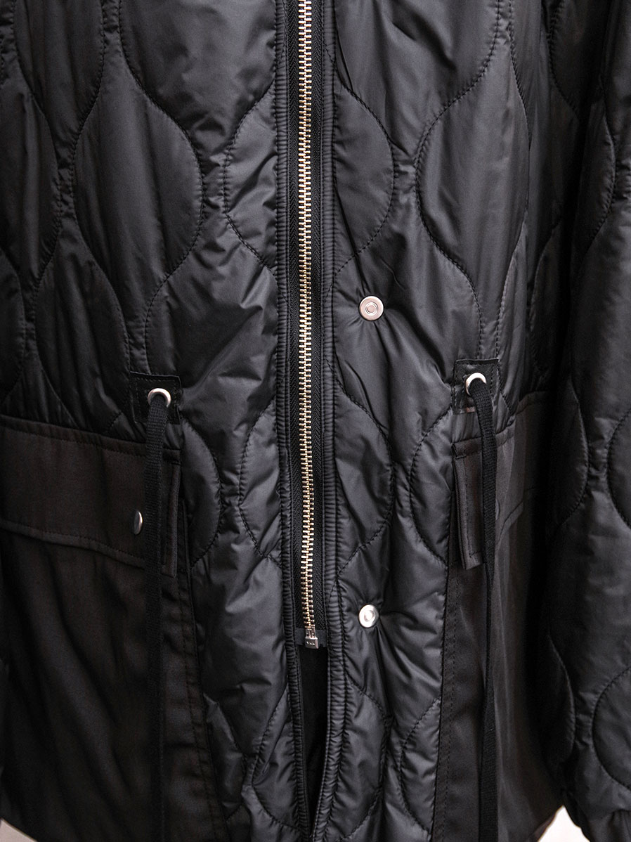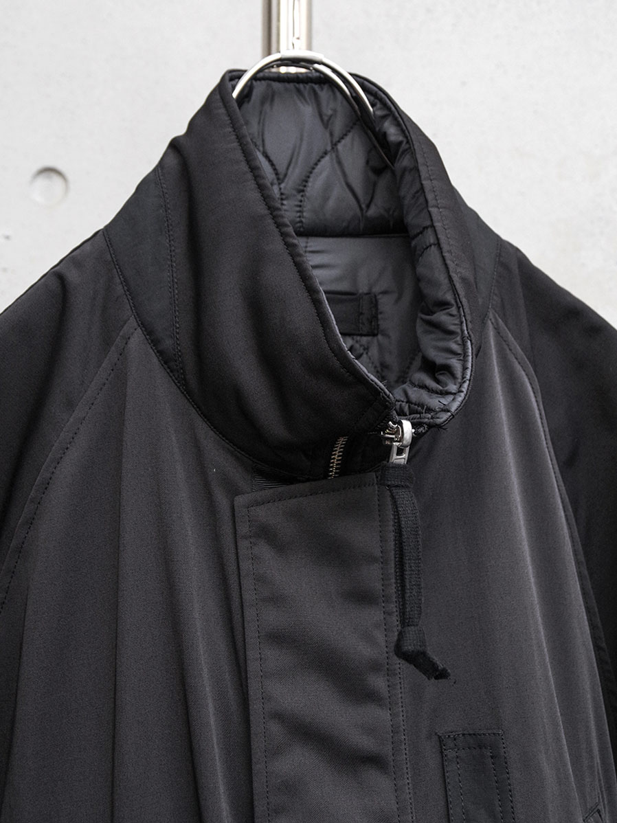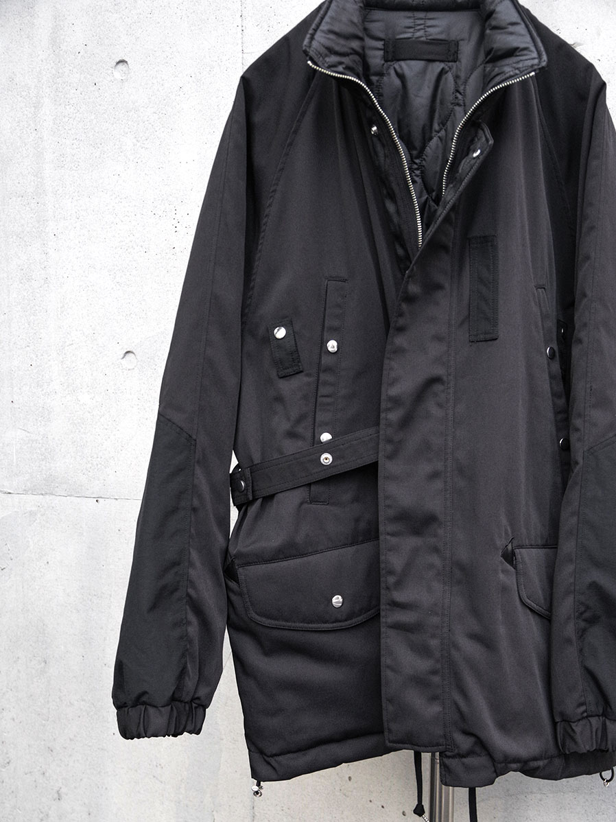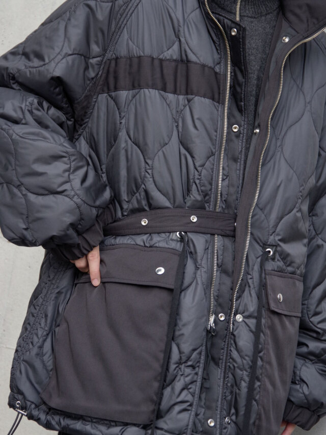 着丈は長すぎず短すぎない絶妙な設定で、ハーフコートのように軽く羽織れる使いやすさもポイント。ウエストにはドローコード、裾にはスピンドルとストッパーを備え、シルエットのアレンジも自在です。ミリタリーの機能美とモードの洗練が共存した、シーズンを代表する一着です。