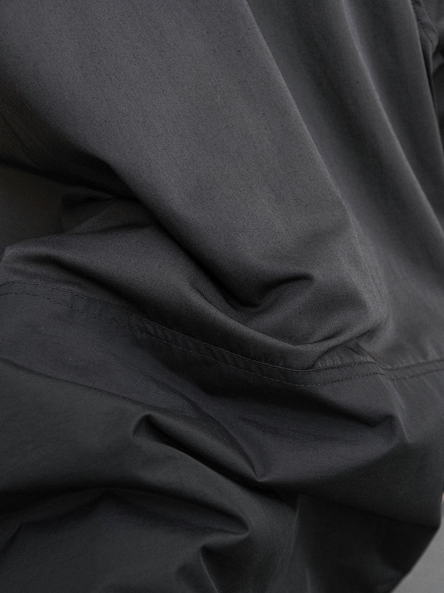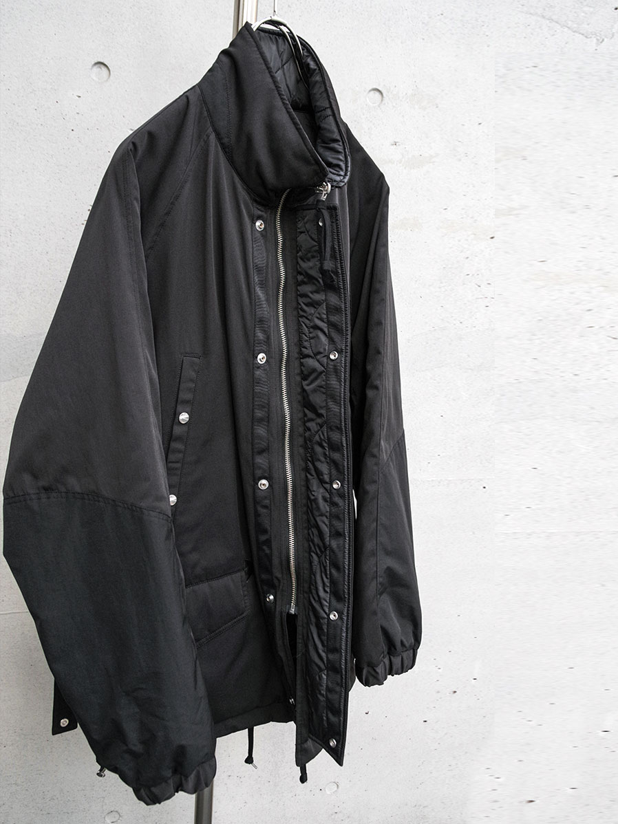 リバーシブル仕様のため、スタイリングによって表情を自在に変化させられるのも魅力。ソリッドでモードにまとめたい時は表側を、程よい抜け感を演出したい時やミリタリーテイストを強めたい時は裏側を表にして着用するのがおすすめです。ナイロンパンツなどとのコーディネートには表側で合わせ、印象を軽く見せたい時には裏側で使うことで、着こなしの幅が広がります。
