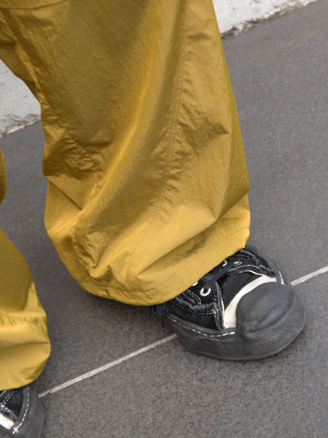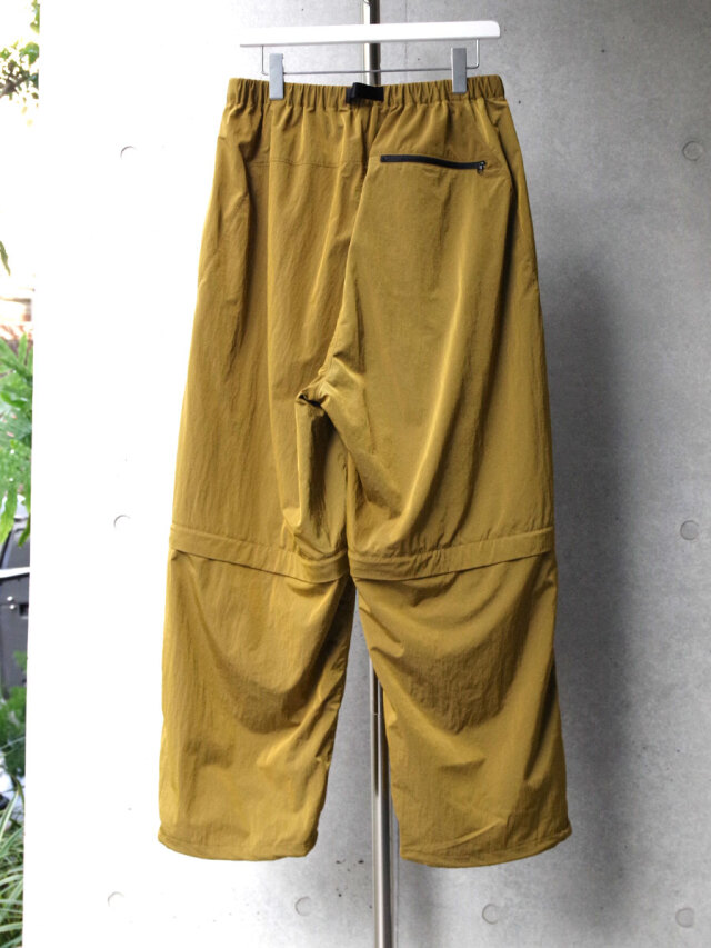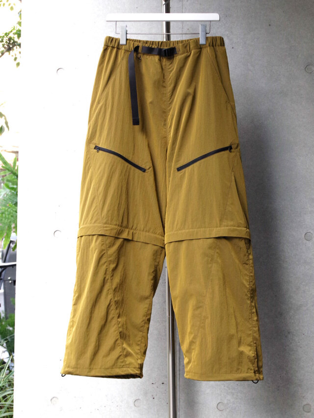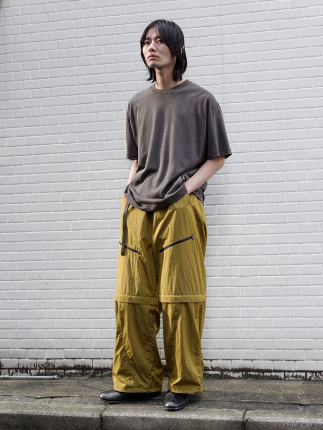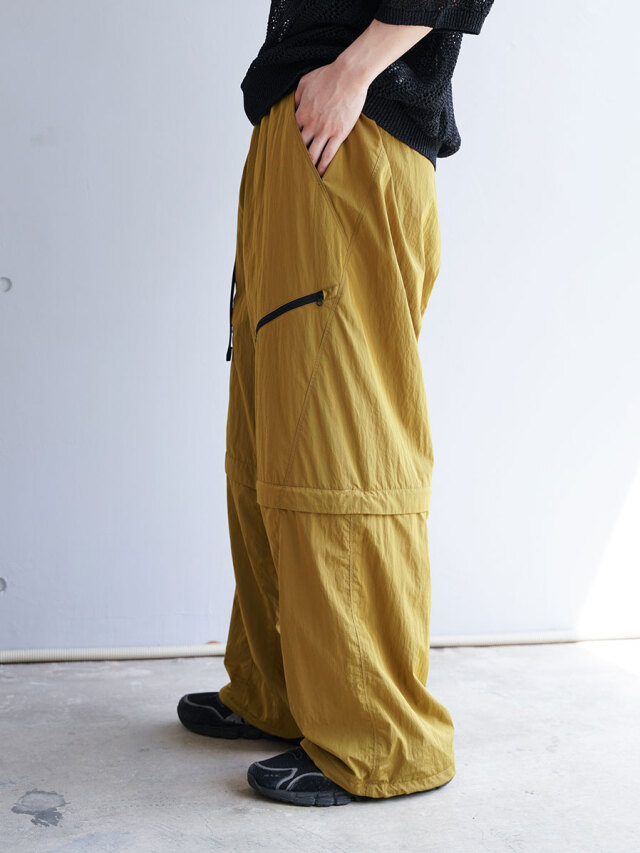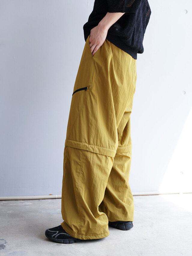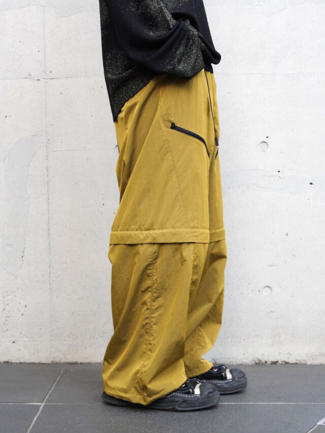 Wide pants with outstanding functionality that can be enjoyed in 2 ways depending on the scene. The part below the knee can be removed with a zipper, and the design can be worn as shorts. Although the silhouette is powerful and super wide, all the accessories are unified in black, giving it a solid impression.
