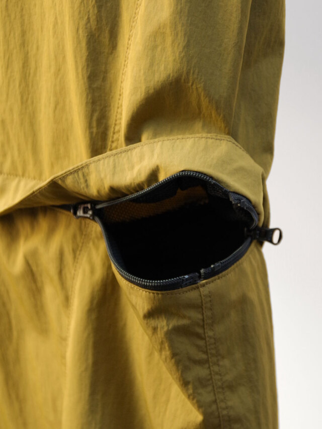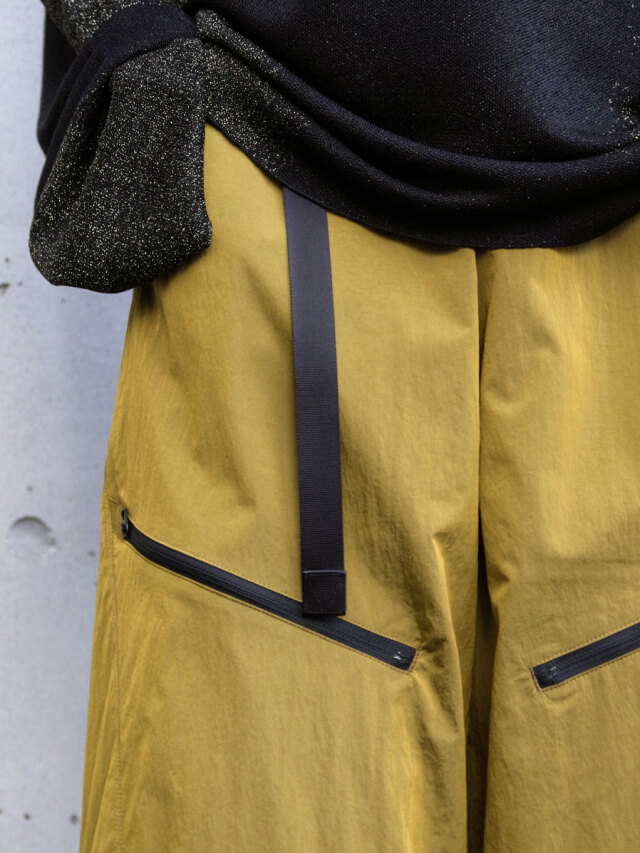 ウエストはウェビングベルトで調整可能、裾はスピンドル仕様でシルエットのアレンジも自在。素材には、独特の光沢感を持つ薄くて軽いリサイクルナイロンシャンブレーを採用し、裏面にはドライタッチなメッシュを使用することで、快適な着心地を実現しました。