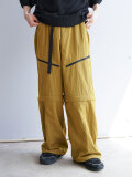 シーンに合わせて2WAYで楽しめる、機能性抜群のワイドパンツ。膝下のパーツはファスナーで取り外し可能で、ショートパンツとしても着用できるデザイン。シルエットは迫力のあるスーパーワイドながら、付属類はすべてブラックで統一し、ソリッドな印象に仕上げました。