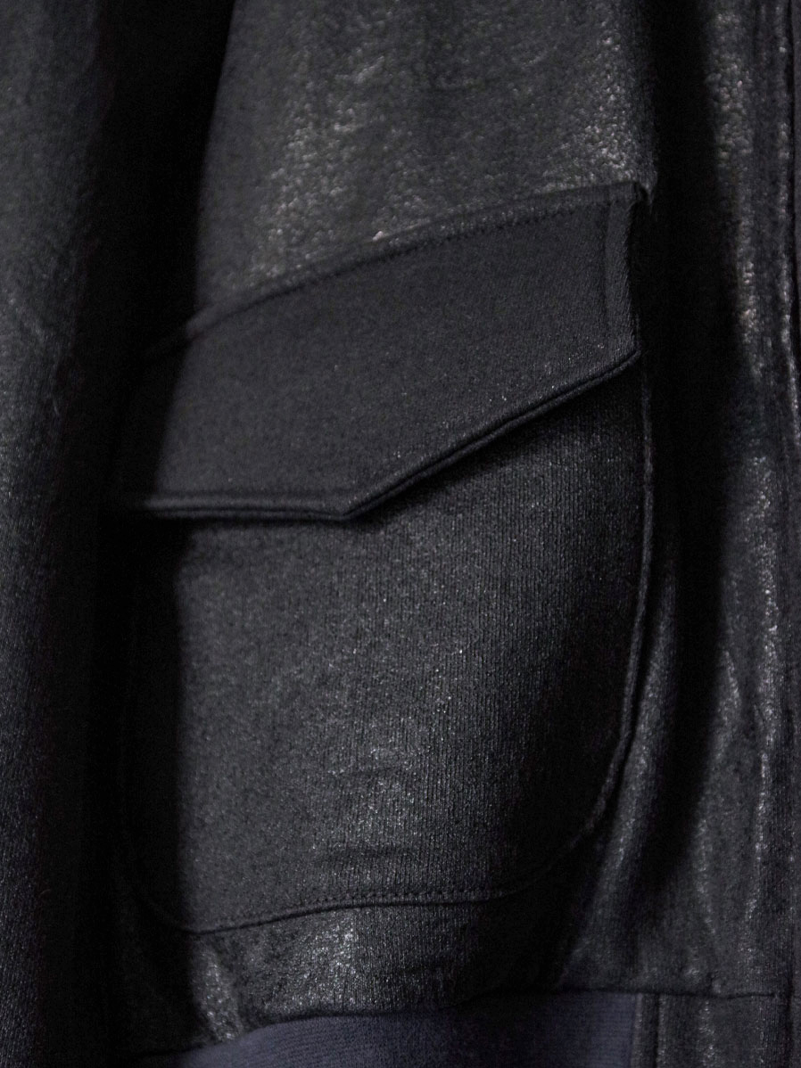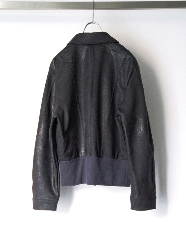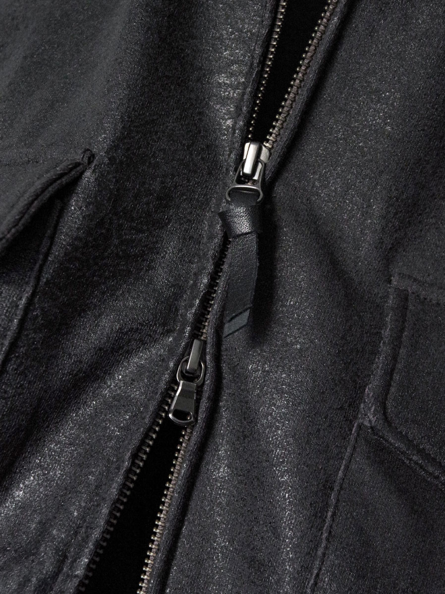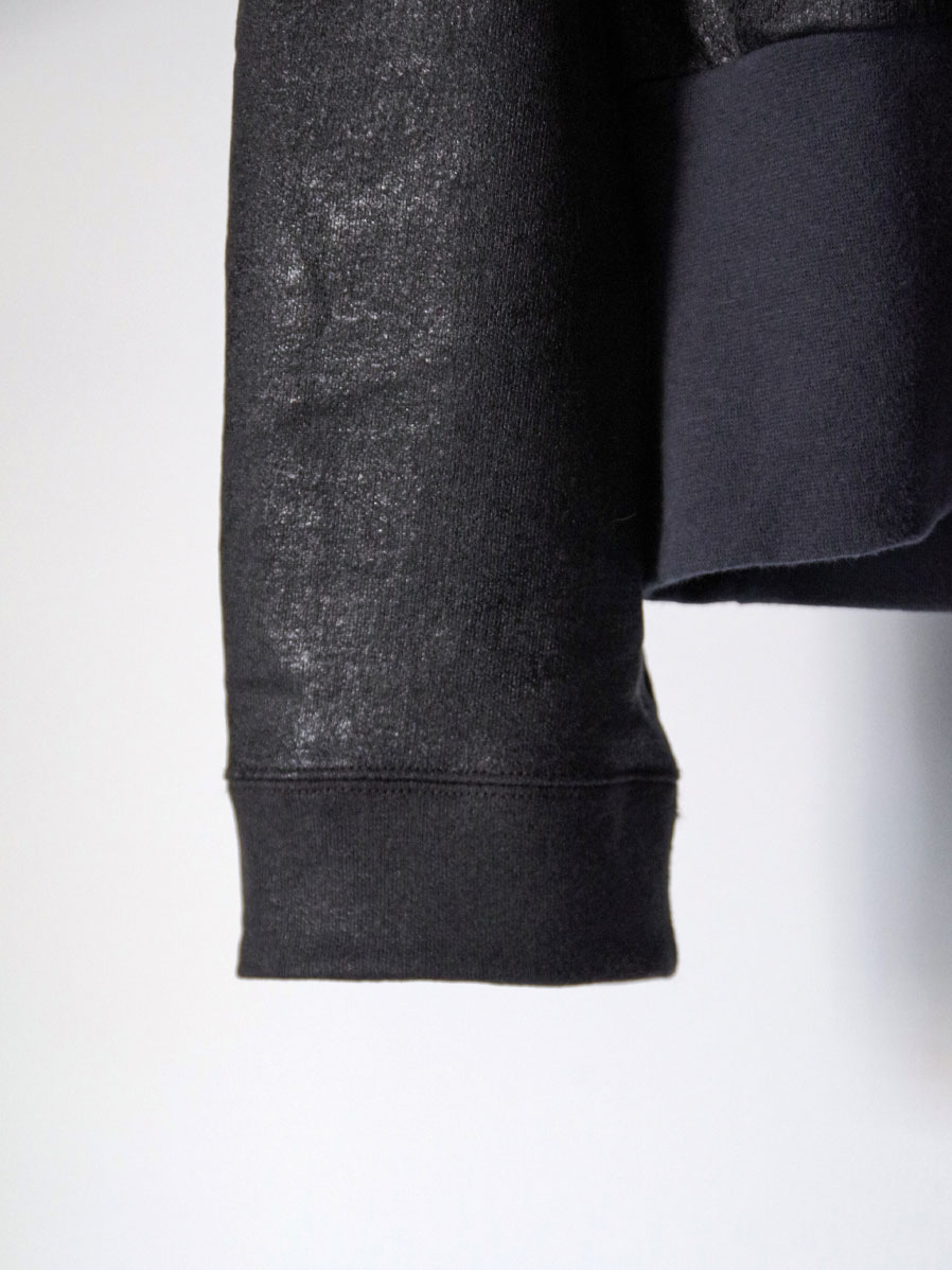 スウェット素材の上からコーティング加工を施し、その後にクラックを加えることで生まれる表情は、確かな技術を持つ職人の手作業によって一点一点仕上げられています。ムラ感や奥行きのある質感がリアルに表現され、スウェット素材でありながら、まるでヴィンテージジャケットのような重厚な佇まいを備えています。