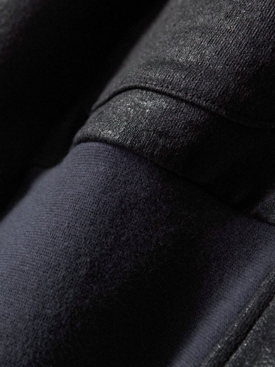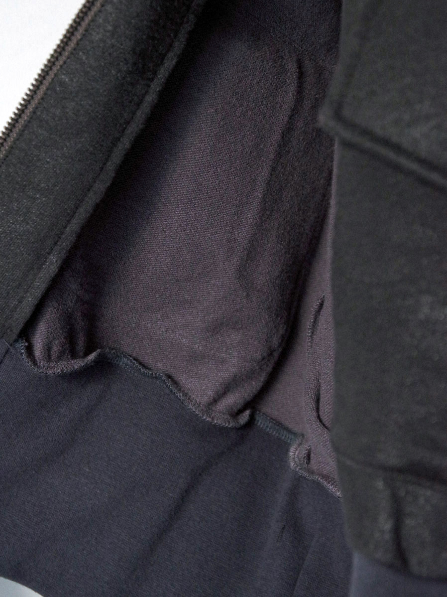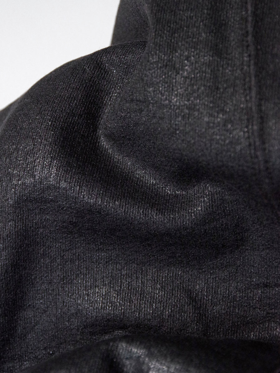 After applying a coating over the sweatshirt base, cracks are introduced by hand, one piece at a time, by skilled artisans. This meticulous process creates rich depth and natural irregularity, resulting in a surface that carries the weight and presence of a vintage jacket despite being made from sweatshirt fabric.
