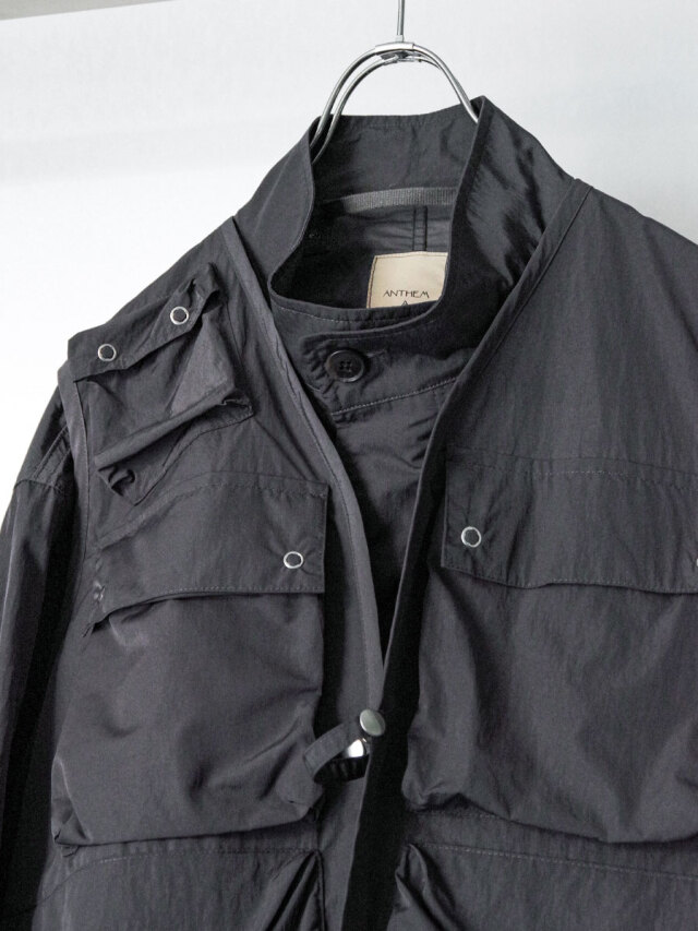 ミリタリーの名作 M-65コート をショート丈に再構築し、ベストを重ねたレイヤードデザインの一着。