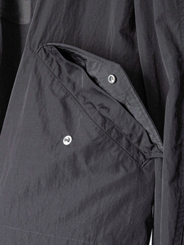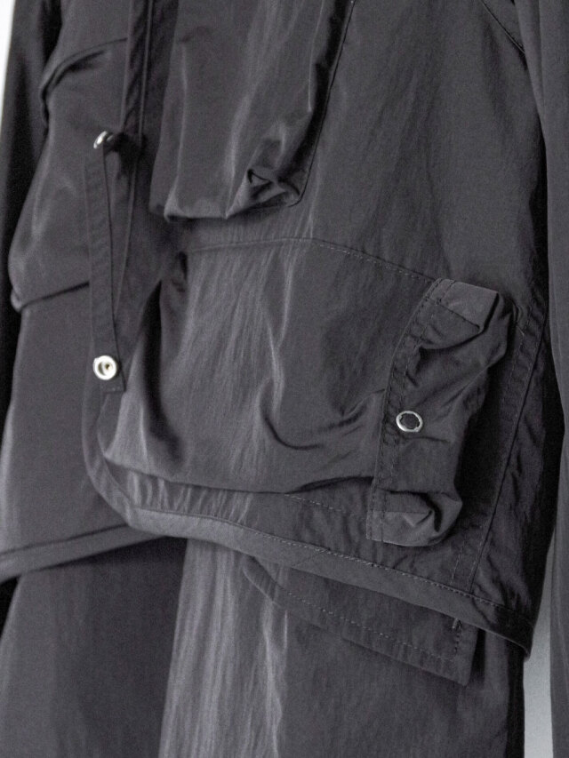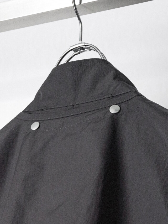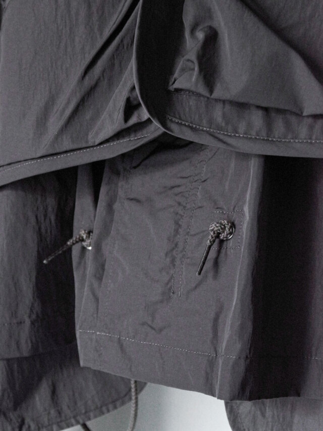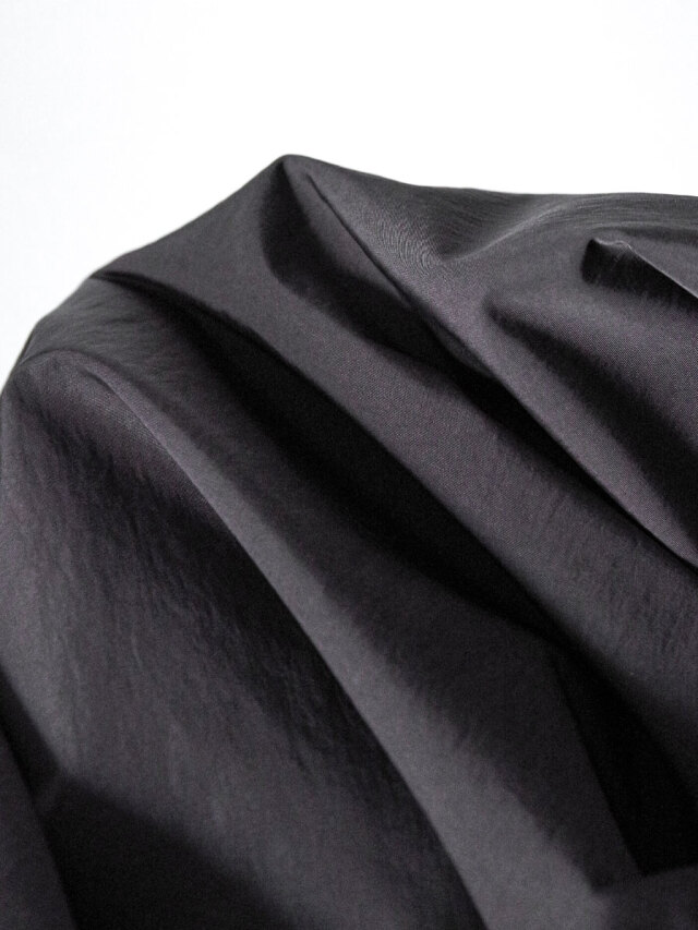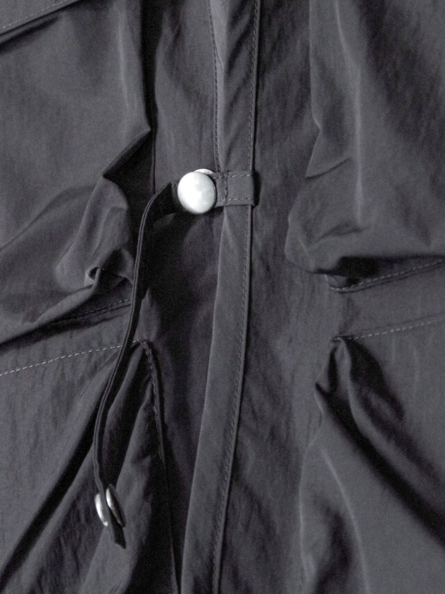 By combining fibers with different heat-shrinkage properties, the fabric achieves a technical texture with a soft, fluid drape. Though lightweight, it is densely woven to resist losing shape, offering volume and rich surface expression. Its high water repellency further enhances durability and everyday functionality.