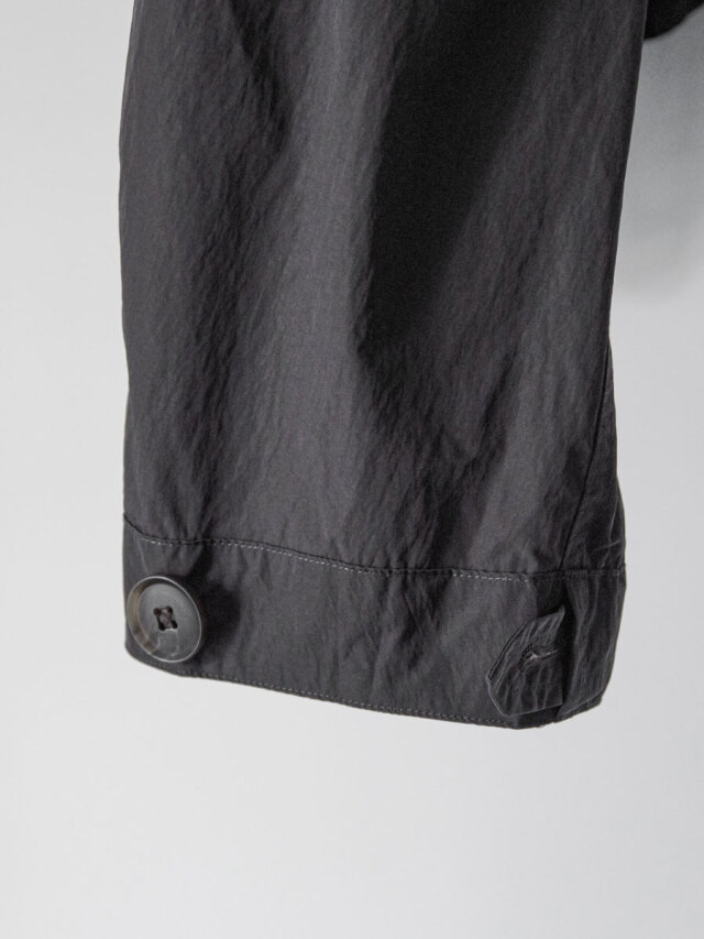 熱収縮温度の異なる繊維を組み合わせることで、テクニカルなタッチと程よいドレープ性を実現しています。薄手ながら高密度で型崩れしにくく、ふくらみのある豊かな表情が特徴。さらに高い撥水性を備えた、タフで実用的な素材感も魅力です。