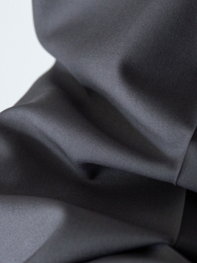 Alongside the wool’s inherent luster, an environmentally conscious AOX-free off-scale treatment is applied, resulting in a fabric with gentle resilience and fluid drape. This process also improves wrinkle resistance, making the material easy to handle in everyday wear.