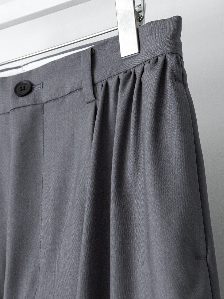 ギャザーによって素材本来のドレープ性がより強調され、歩くたびにふんわりとした広がりが生まれ、リラックス感のある佇まいに仕上がっています。