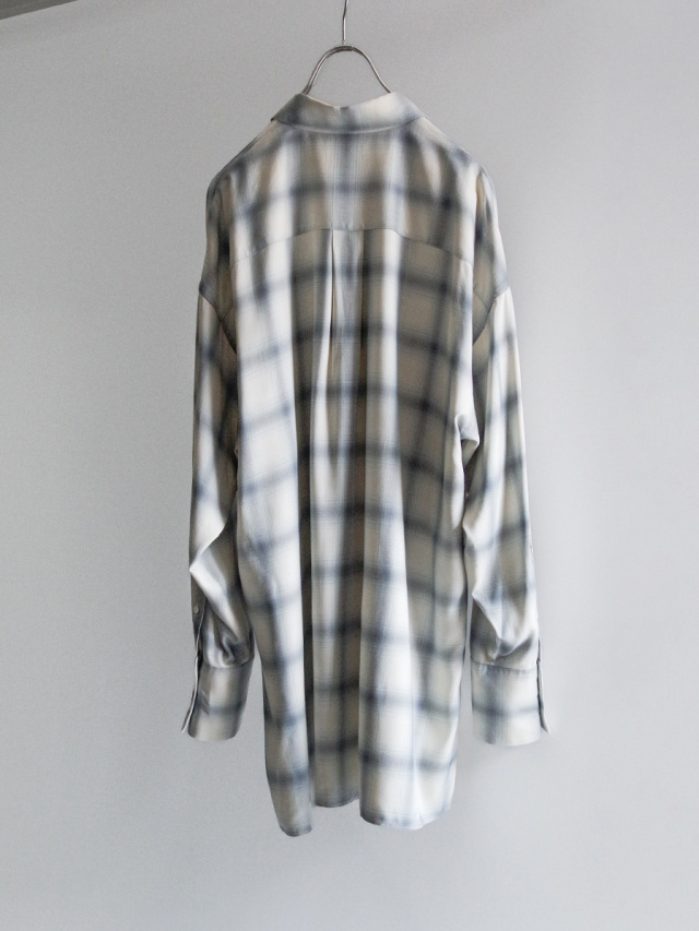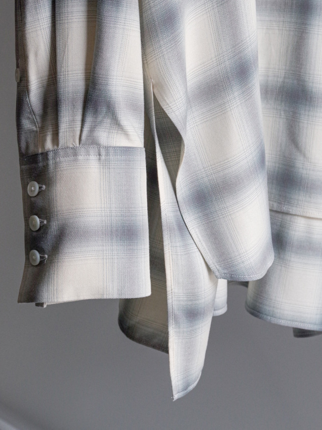 素材には、極細スパンレーヨンを使用したオンブレーチェックのシャツ地を採用。ドレープの美しさとしっとりとした肌触りで、快適な着心地を叶えています。