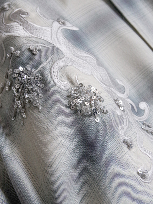 胸元にはスパンコールとサテン織を組み合わせた、存在感ある刺繍モチーフを配置。これは、"重ねる"をイメージテーマにした際にデザイナーが椎名林檎氏の楽曲「おこのみで」にインスピレーションを受けて描き下ろした特別な図案です。