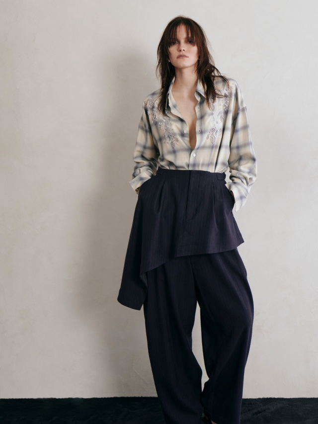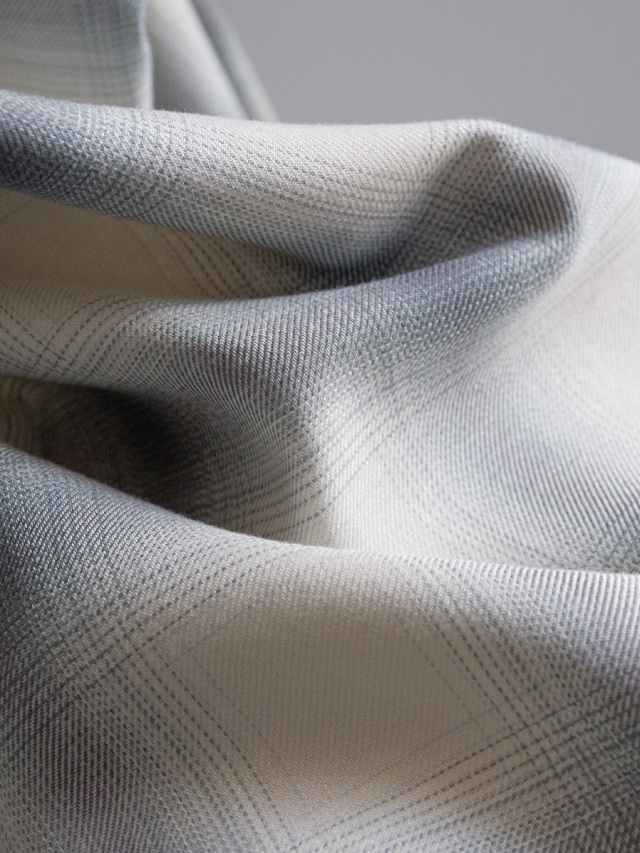 Crafted from ultra-fine spun rayon in an ombre check pattern, the fabric delivers a fluid drape and a smooth, soft touch against the skin.