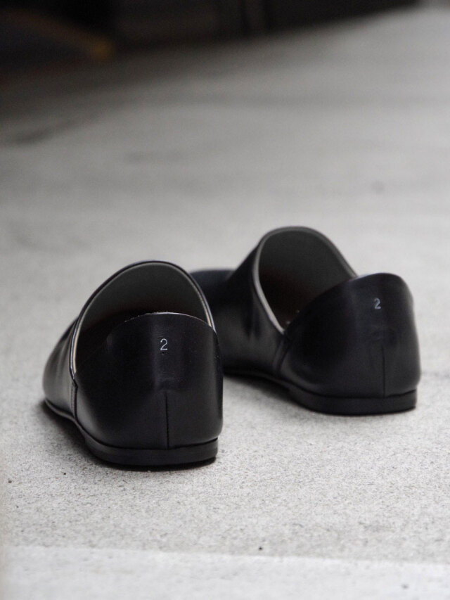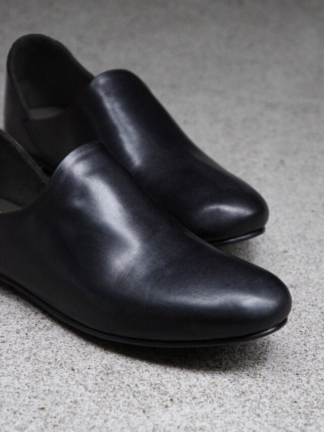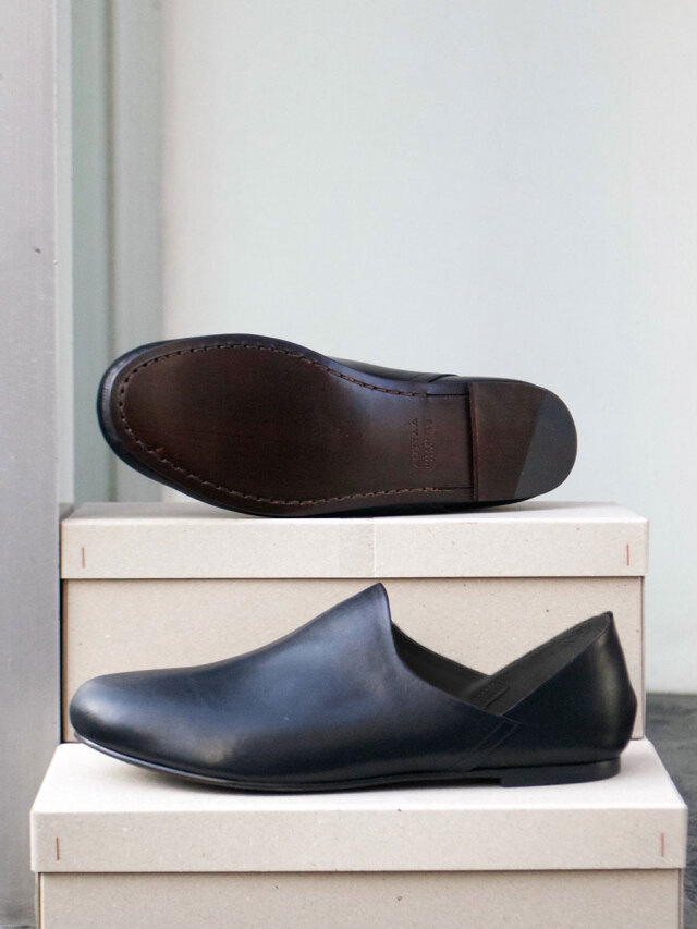 当店の取り扱う服と非常に相性が良く、長年にわたりコーディネートを文字通り足元から支え続けてきた殿堂入りのレザーシューズです。ドレスシューズほどかっちりし過ぎず、スニーカーよりも上品に履きこなせる絶妙なバランス。無駄な装飾のないミニマルなフォルムはどんなスタイルとも合わせやすく、一足あるとコーディネートにとても重宝します。製法はソールの返りが良いマッケイ製法で、靴職人のもとで一つ一つ丁寧に製作されています。