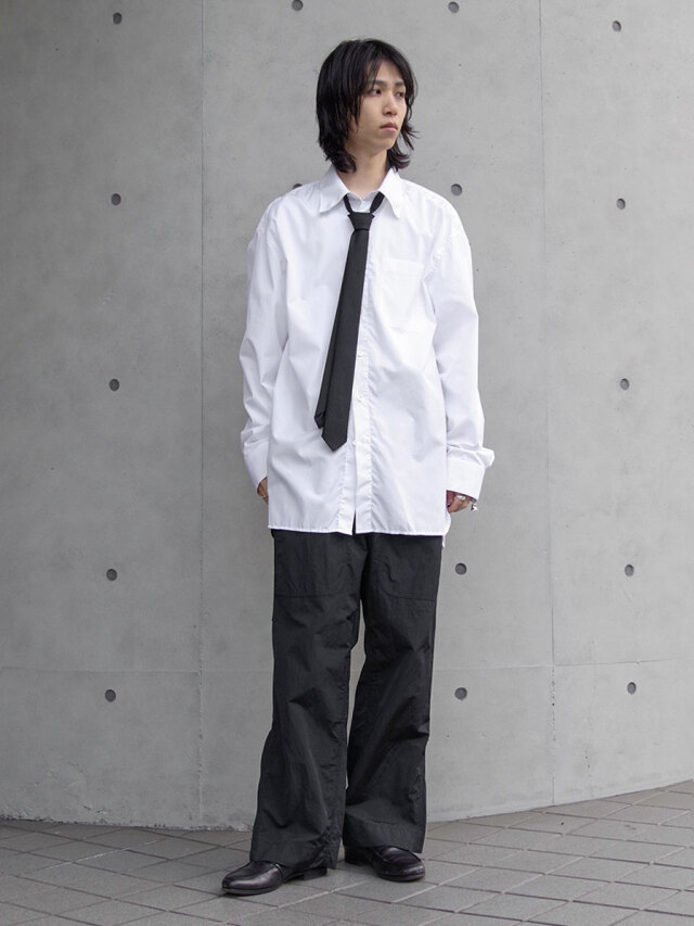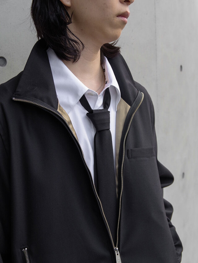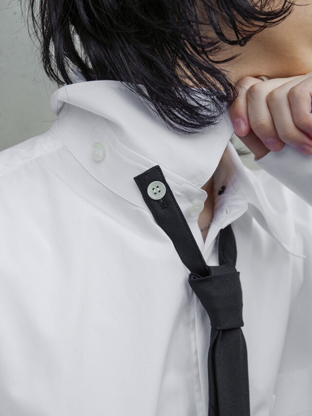 取り外し可能なネクタイが襟元に付属し、シーンや気分に合わせて表情を変えられる一着。クラシックな装いに程よいひねりを加え、スタイリングの幅を広げてくれます。