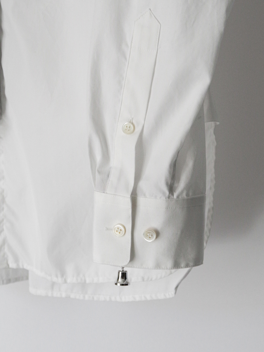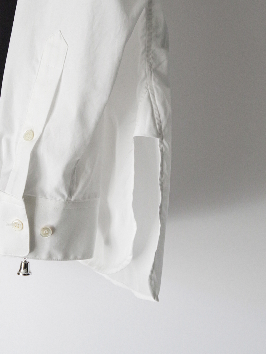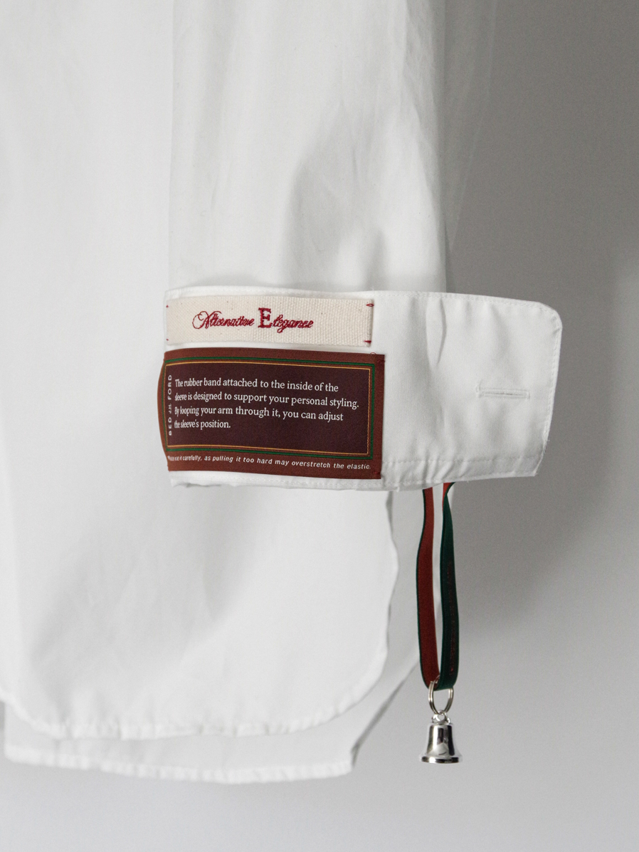The inside of the sleeve features the brand's original flat elastic detail. In addition to the functionality of making it easy to roll up your sleeves, the small bells threaded through the elastic make a subtle sound as you move, adding a poetic nuance to your outfit.