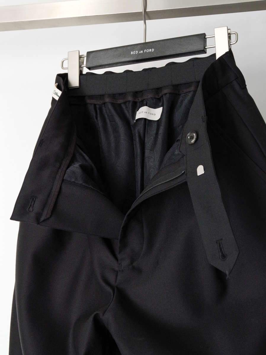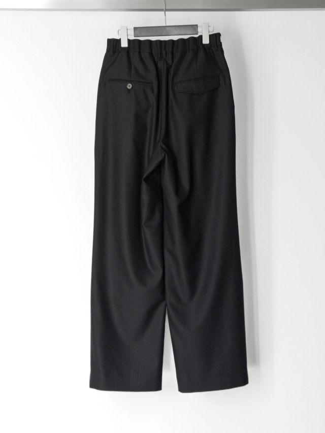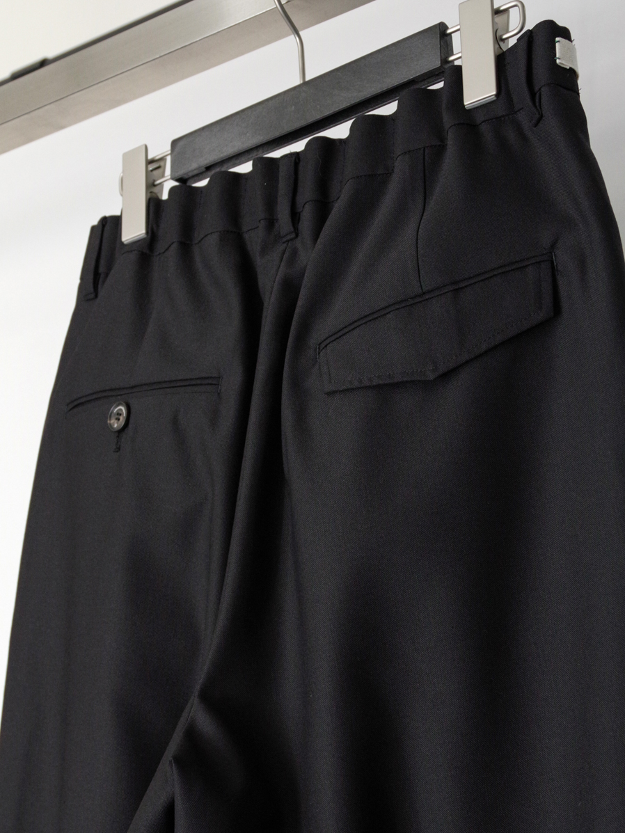 見た目の端正さを保ちながら、快適な穿き心地を実現しています。フロントにはインタックを配し、腰まわりに程よいゆとりを持たせつつも、全体としてはスマートで品のある印象に仕上げました。腰まわりにデザインを効かせることで、タックインスタイルにも相性の良い一本です。