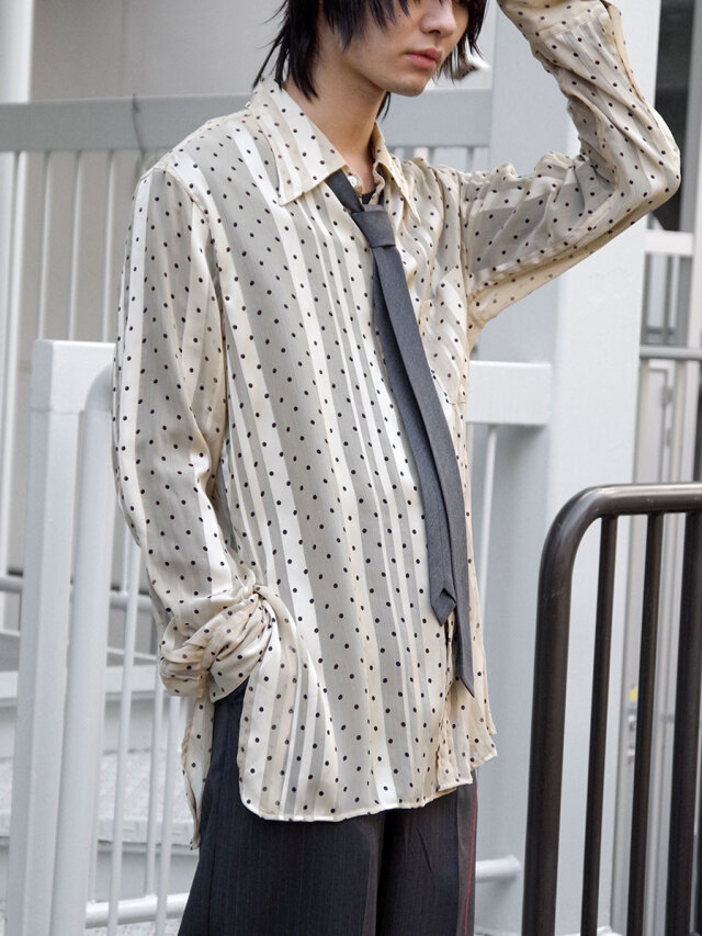 小ぶりで上品なドット柄の背後には、うっすらとストライプが浮かび上がるようにデザイン。ストライプは線の太さが不均一で、グラデーションのように見えるのも特徴です。透け感のある生地のため、インナーの色によってストライプの見え方が変化し、着こなしに奥行きをもたらします。
