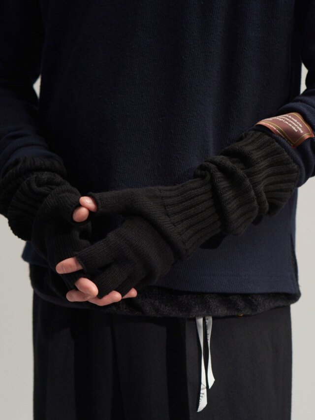 The long design covers the wrists well, allowing for free arrangements such as peeking out from the cuffs or gathering the fabric to enjoy the volume. Since your fingertips are free to use, it is convenient for operating smartphones and detailed work.