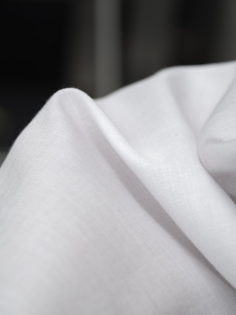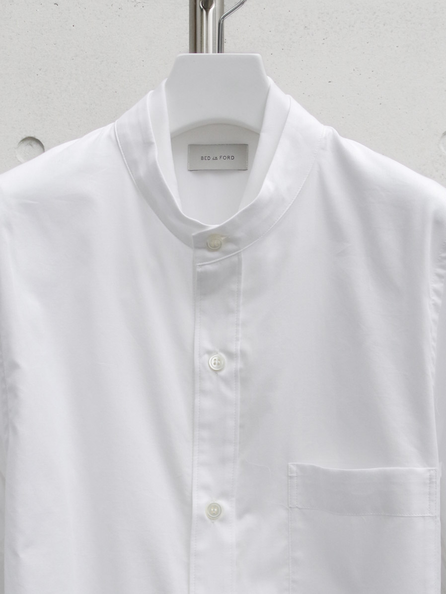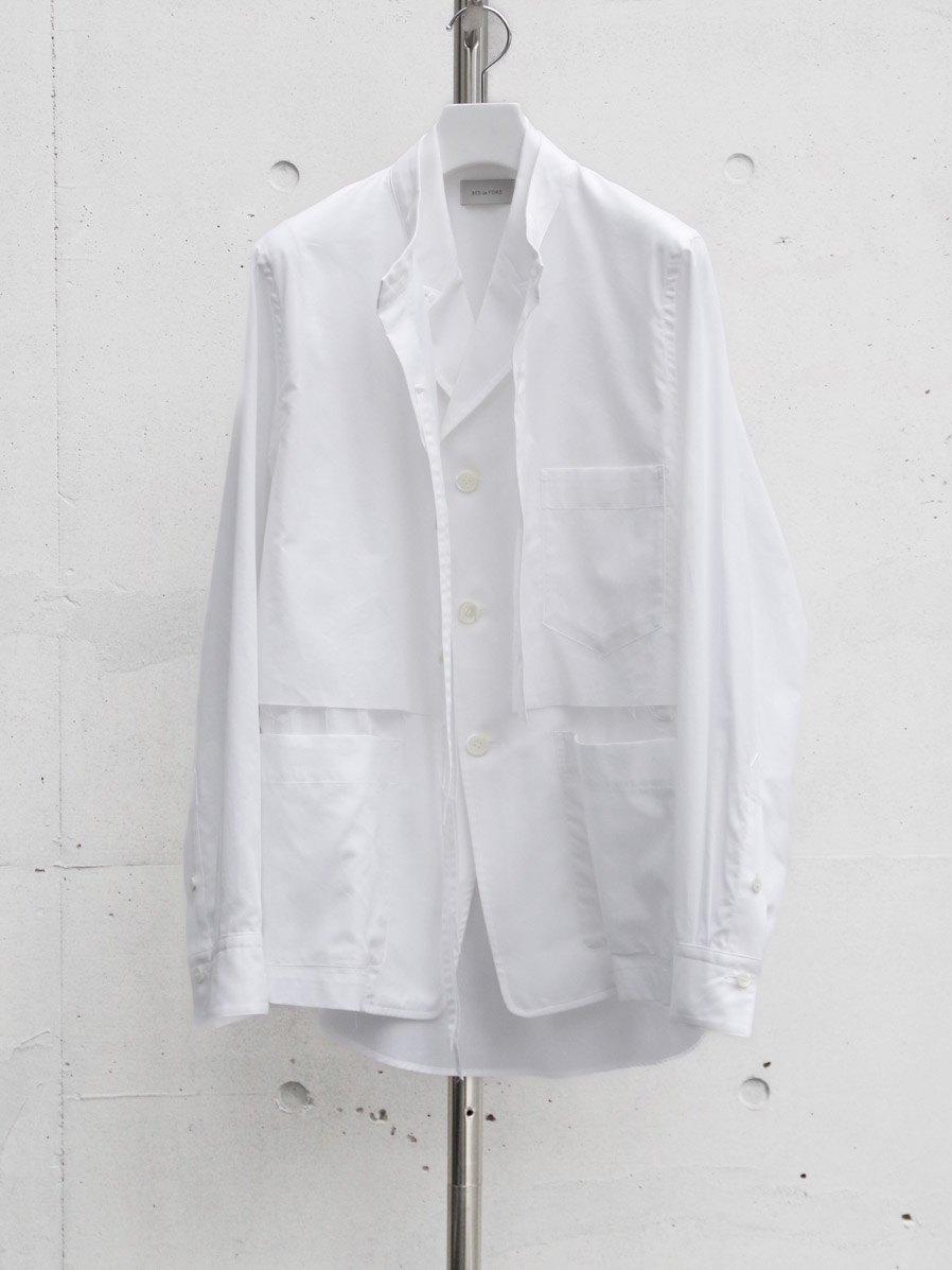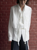 外側のバンドカラーシャツは、前立て裏側にコードが縫い付けられており、様々な見せ方でアクセントに。ボタンの開け具合によってレイヤーの見え方を変えることで、気分に応じた個性的なスタイリングを楽しむことができます。