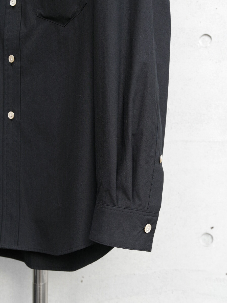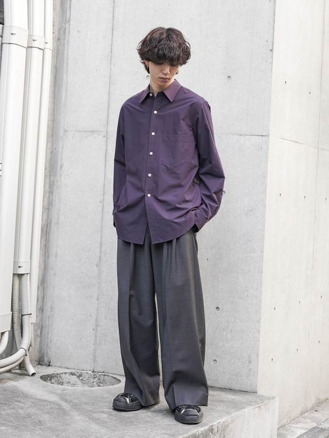 緩やかに弧を描き美しいラインを引き出したアーム、袖先に3つのタックを設け綺麗な収まりを生み出しています。一見はシンプルに見えますが、真骨頂とも言えるパターンワークで快適な着心地とそのシルエットは賜物。レイヤードスタイルを後押しする裾周りのカッティングなど、絶妙な調整を繰り返し形となっています。