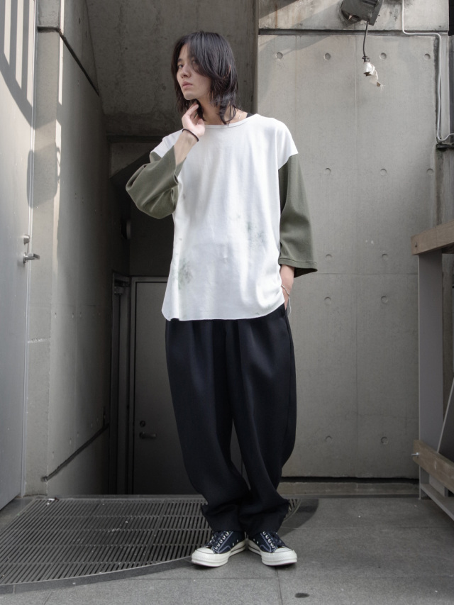 ざらっとしたドライな質感と豊かな伸縮性でとても快適な着心地に。裾は緩やかなラウンドを描き、ゆとりのあるシルエットの中にもサイドに抜け感が生まれ軽やかな空気感を演出。