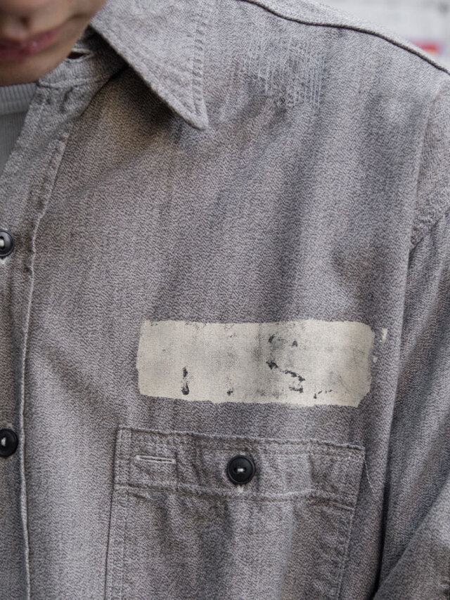 デザインベースは1940年代以前のヴィンテージプリズナーシャツ。背面にうっすらと囚人番号が残るヴィンテージのブラックシャンブレーシャツをイメージして製作されています。