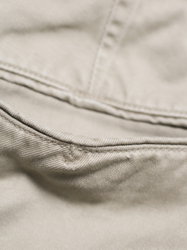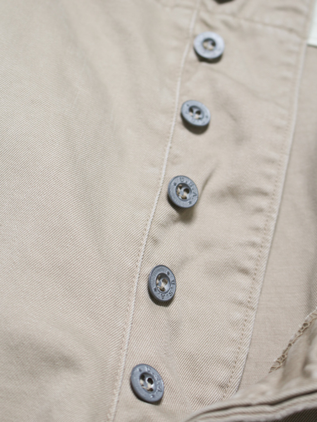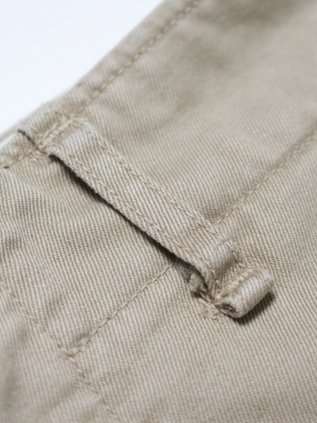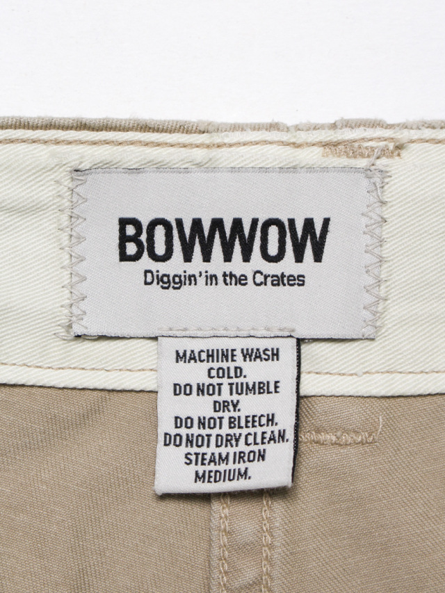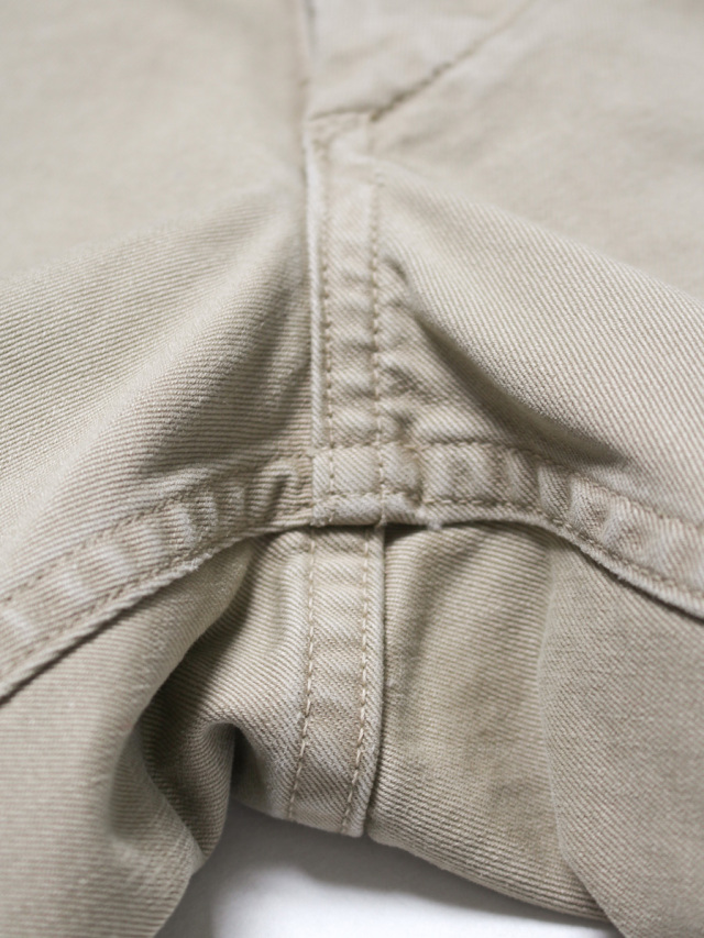 今までBOW WOWにより製作された41 KHAKIの原型にあたり、生産性を考えて省かれたもみ玉縁ポケット、中高ベルトループ、メタルボタンなどのディテールは、現代の服から感じえない趣を宿しています。