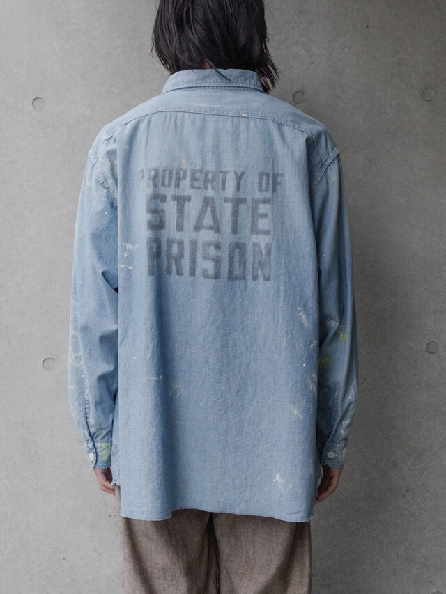 1960年代、アメリカの刑務所で着用されていたプリズナーシャンブレーシャツをデザインモチーフに、BOWWOWならではの巧みな加工技術でヴィンテージの雰囲気を見事に再現した一着。背面に大きくプリントされた「PROPERTY OF STATE PRISON」のテキストが圧倒的な存在感を放ちます。