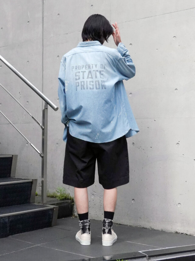 Originally, shirts used in prisons were never allowed to go outside, and due to their rarity, they are highly popular in the vintage market. This work faithfully reproduces the atmosphere and details of the time, while giving it a slightly larger silhouette and unique processing unique to BOWWOW, resulting in a well-balanced silhouette that fits in with modern fashion.