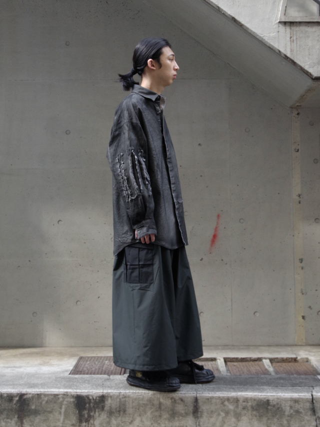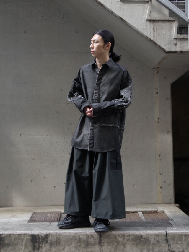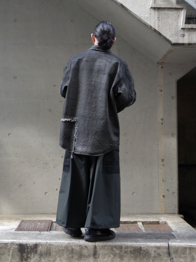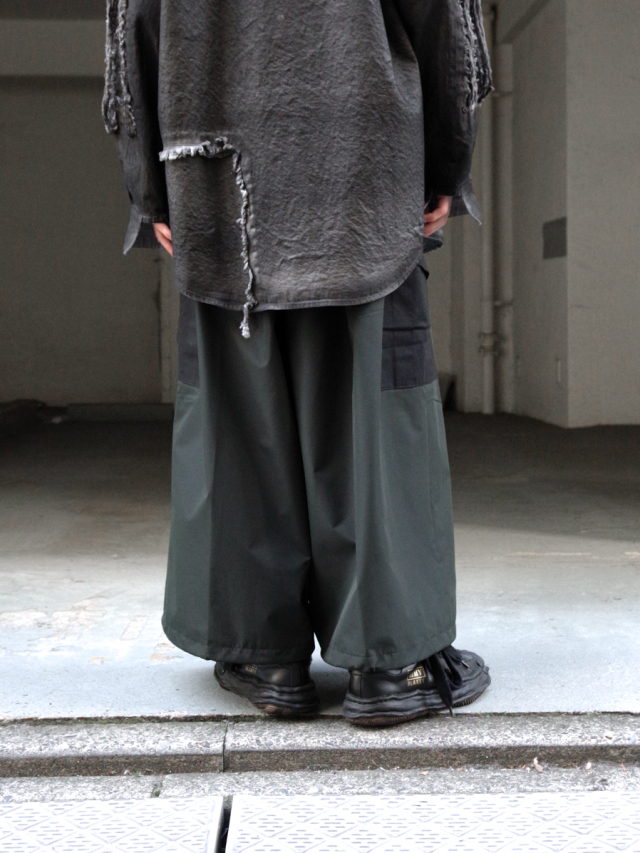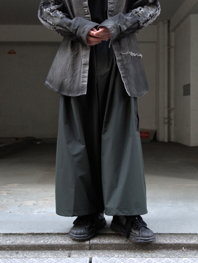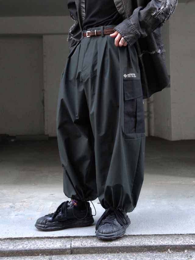 ヨウジヤマモト出身のデザイナーならではのアプローチでワイドクロップドパンツというカテゴリをGORE-TEXを用いて表現された本作。腰回りに多くのタックを設けることでボリュームのあるシルエットながらも生地にドレープが出て美しい落ち感を表現しています。
