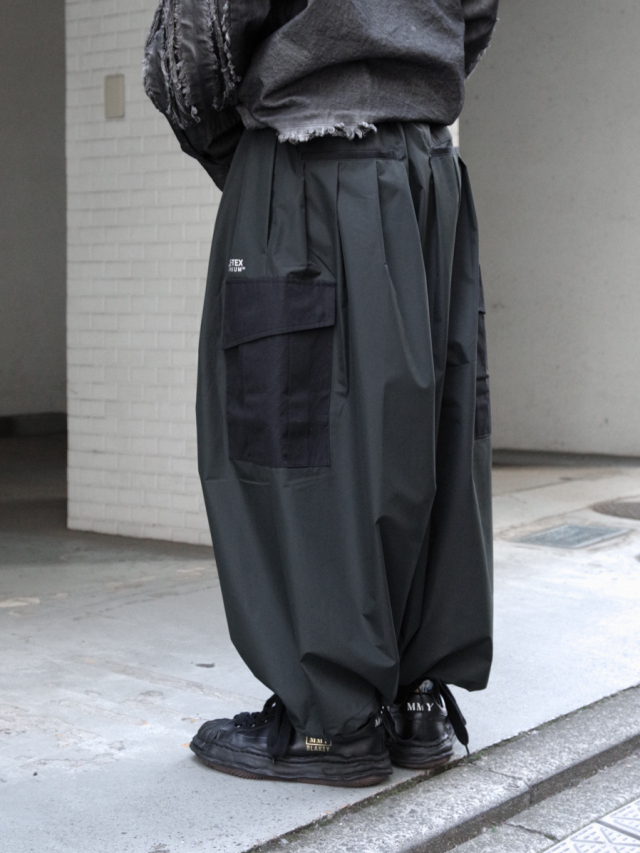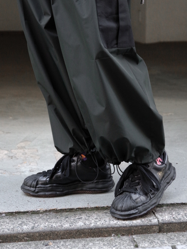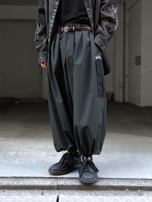 ウエストはゴム+ドローコード内蔵。裾を絞ることでバルーンシルエットにも様変わりする仕様は、トップスやシューズに応じて様々なスタイリングに合わせることができます。ボリュームのあるスニーカーやブーツとの合わせもおすすめ。雨の日にはレインシューズと合わせて悪天候さえ楽しませてくれるでしょう。
