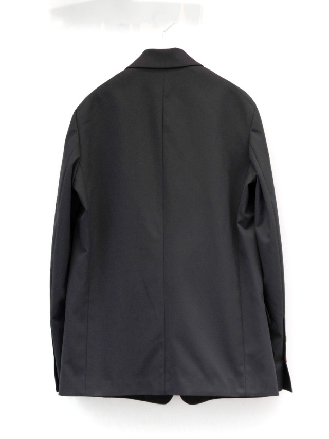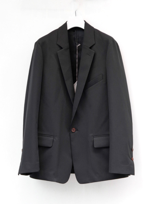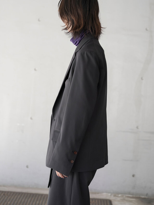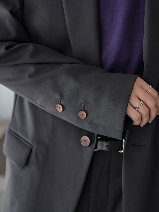 ラペル部分を深くとった独特のデザインはブランドならでは。アンコン仕立てで作られた全体的な印象は、優雅でありながらも脱力感のあるルックスに。美しいカッティングワークや、安直なドロップショルダーではないクラシックな袖付けからすらっと伸びるアームの線形など、エドウィナホールらしい世界観が表現されています。